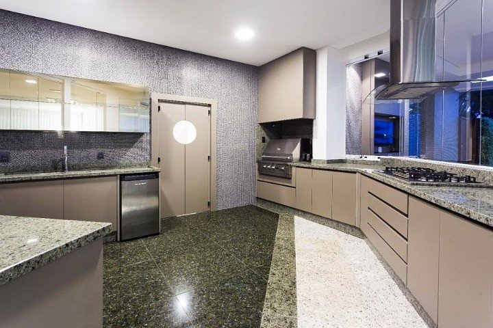Com bancada equipada, sala de estar integrada e mesa de jogos, o espaço gourmet é perfeito para encontros entre amigos. A decoração contemporânea e o piso em granito elevam o nível de sofisticação, tornando cada reunião mais especial.