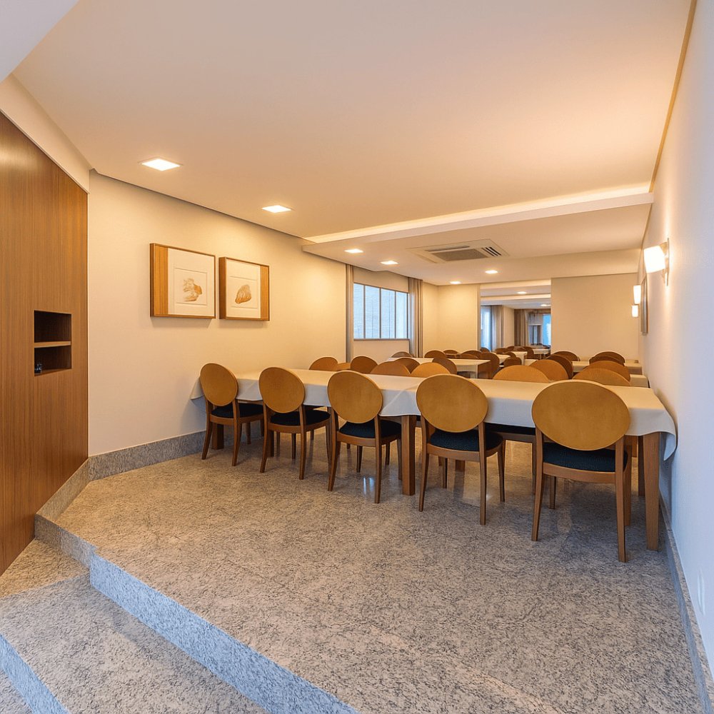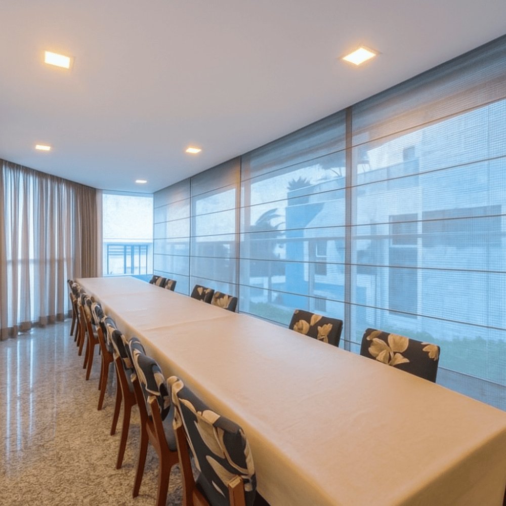 Projetado para celebrar momentos especiais, o salão de festas do Atlantis combina praticidade e bom gosto. A longa mesa central é rodeada por cadeiras estofadas com estampas florais delicadas, enquanto a iluminação suave e as cortinas translúcidas garantem um ambiente versátil, ideal para comemorações intimistas ou recepções refinadas.