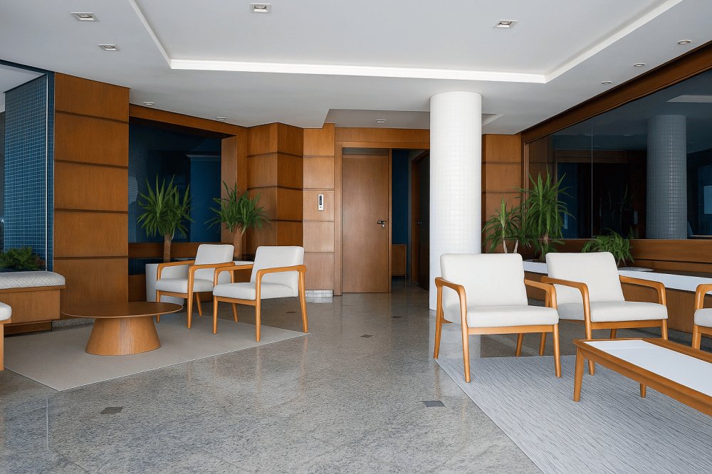 Para receber visitantes com elegância, a sala de espera combina tons amadeirados, poltronas estofadas e iluminação suave. Um espaço pensado para oferecer conforto e sofisticação logo nos primeiros minutos dentro do edifício - perfeito para quem valoriza os pequenos detalhes que fazem toda a diferença.
