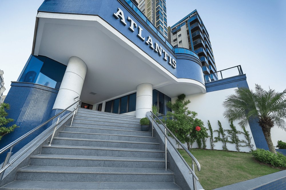 Logo ao primeiro olhar, a fachada do Edifício Atlantis já entrega a grandiosidade do projeto. Revestida com pastilhas em tons de azul que dialogam com o mar à frente, a entrada conta com uma escadaria em granito e paisagismo meticulosamente planejado. O nome "ATLANTIS" se destaca com elegância, reforçando a exclusividade e o alto padrão do empreendimento.