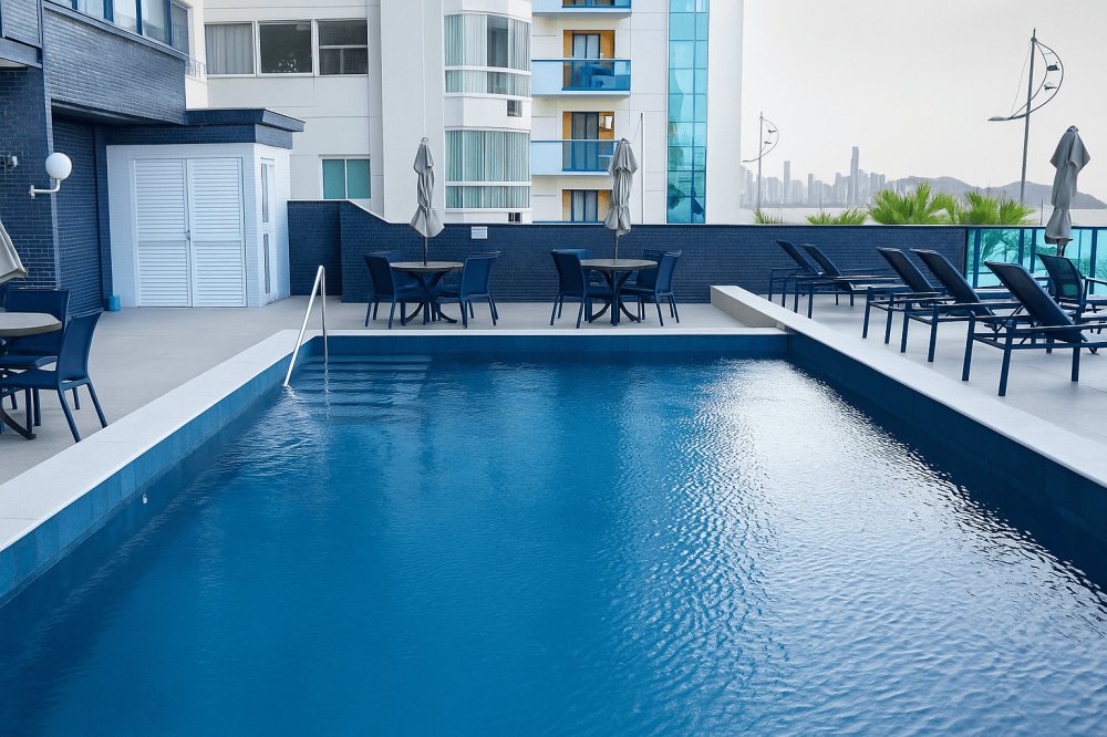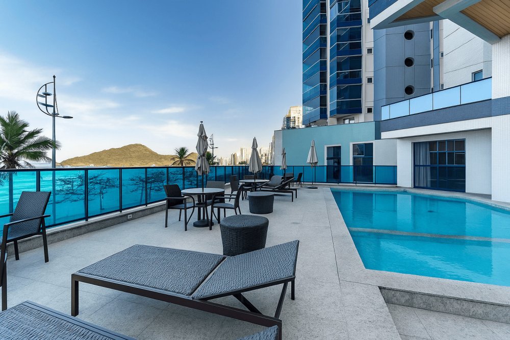 Localizada na cobertura, esta piscina suspensa oferece uma das vistas mais impressionantes de toda a Barra Sul. O espaço integra-se ao terraço gourmet com mobiliário elegante e vidro azul nos guarda-corpos, permitindo uma experiência visual contínua entre céu, mar e cidade. Perfeito para contemplar o entardecer com sofisticação e privacidade.
