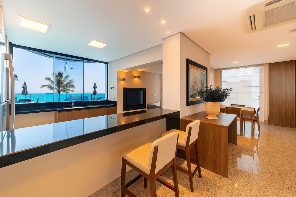 O ambiente ideal para encontros sociais ganha ainda mais charme com a vista direta para o oceano. Com bancada em granito escuro, iluminação quente e mobiliário de alto padrão, o espaço gourmet do Edifício Atlantis transforma cada ocasião em uma experiência sensorial única - onde o paladar se alia à beleza do cenário litorâneo.