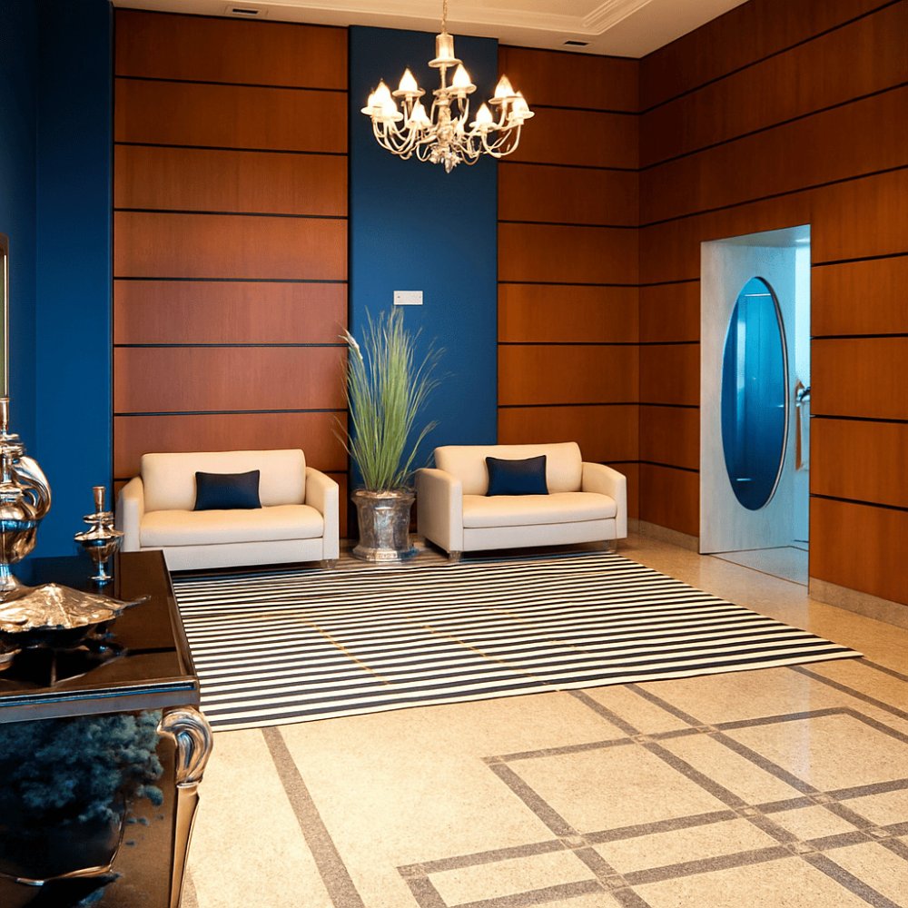 Combinando o clássico ao contemporâneo, o hall principal do Edifício Atlantis impressiona com sua composição refinada: poltronas elegantes, tapete listrado de bom gosto, lustre de impacto e paredes em azul profundo com painéis de madeira. Um ambiente que traduz o espírito sofisticado do empreendimento desde o primeiro passo.