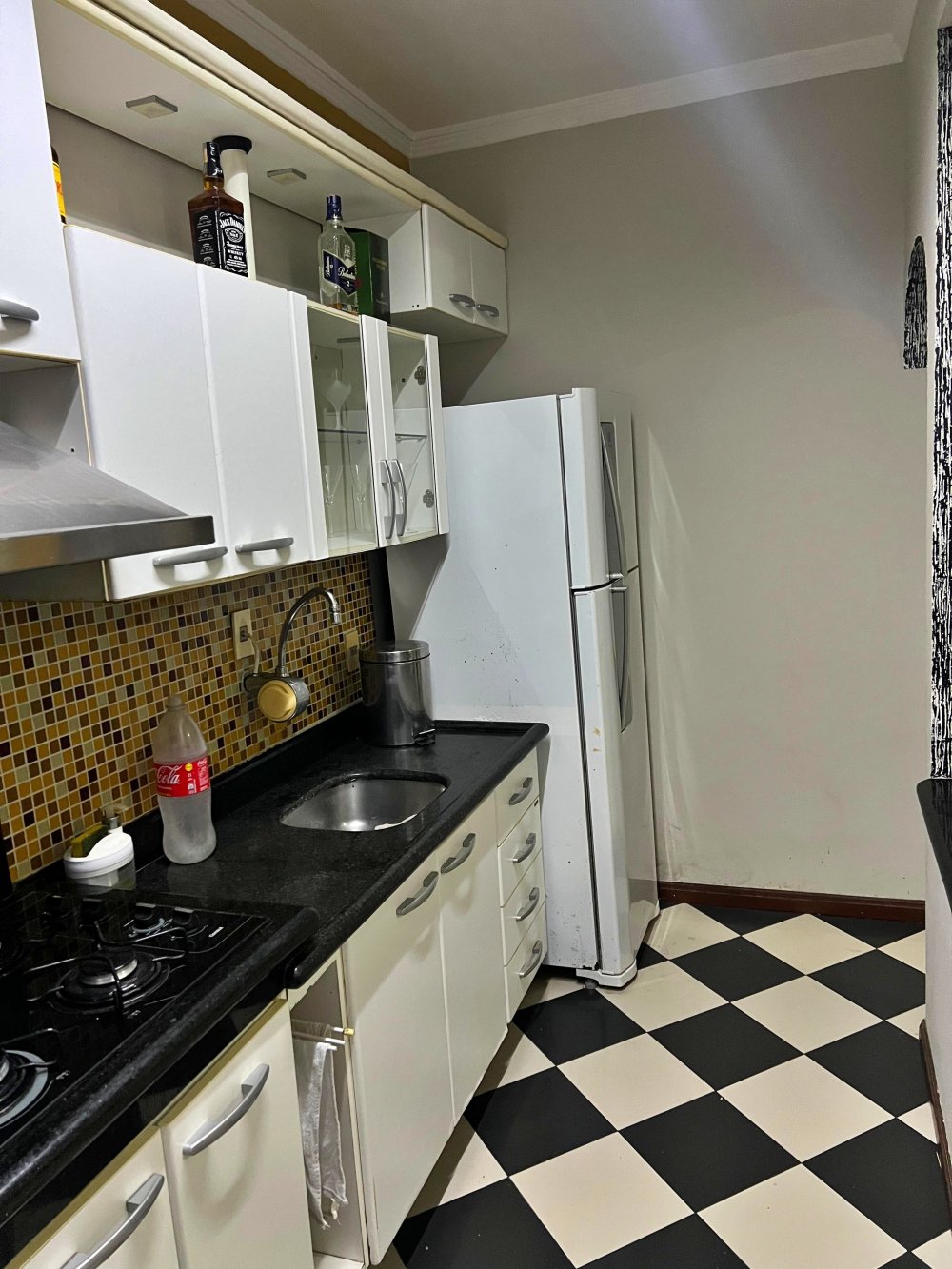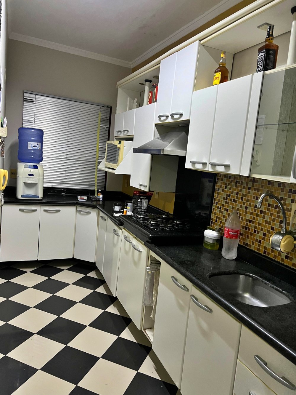 A cozinha planejada alia funcionalidade e estética. Os armários brancos de acabamento moderno contrastam com a bancada em granito preto e o piso xadrez, criando um estilo retrô sofisticado. Em formato "L", o espaço permite fluidez entre as tarefas culinárias e integração com a sala de jantar. É o tipo de ambiente que torna a rotina mais leve e prazerosa.