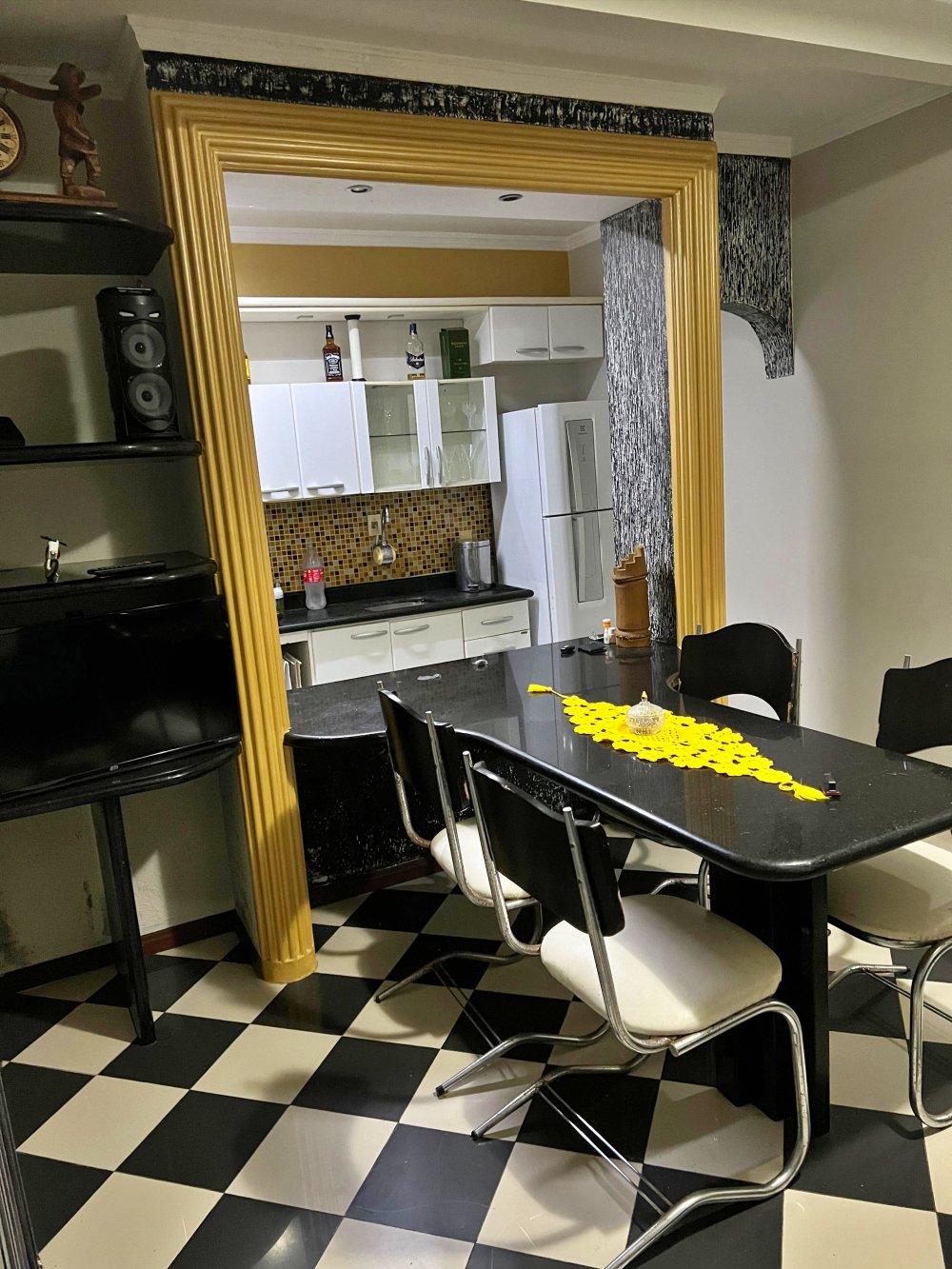 Integrada à cozinha e à sala de estar, a sala de jantar é ideal para momentos em família ou com amigos. A mesa espaçosa e as cadeiras confortáveis ganham destaque com o piso em preto e branco e molduras douradas que trazem identidade ao ambiente. Aqui, o cotidiano se transforma em momentos especiais.