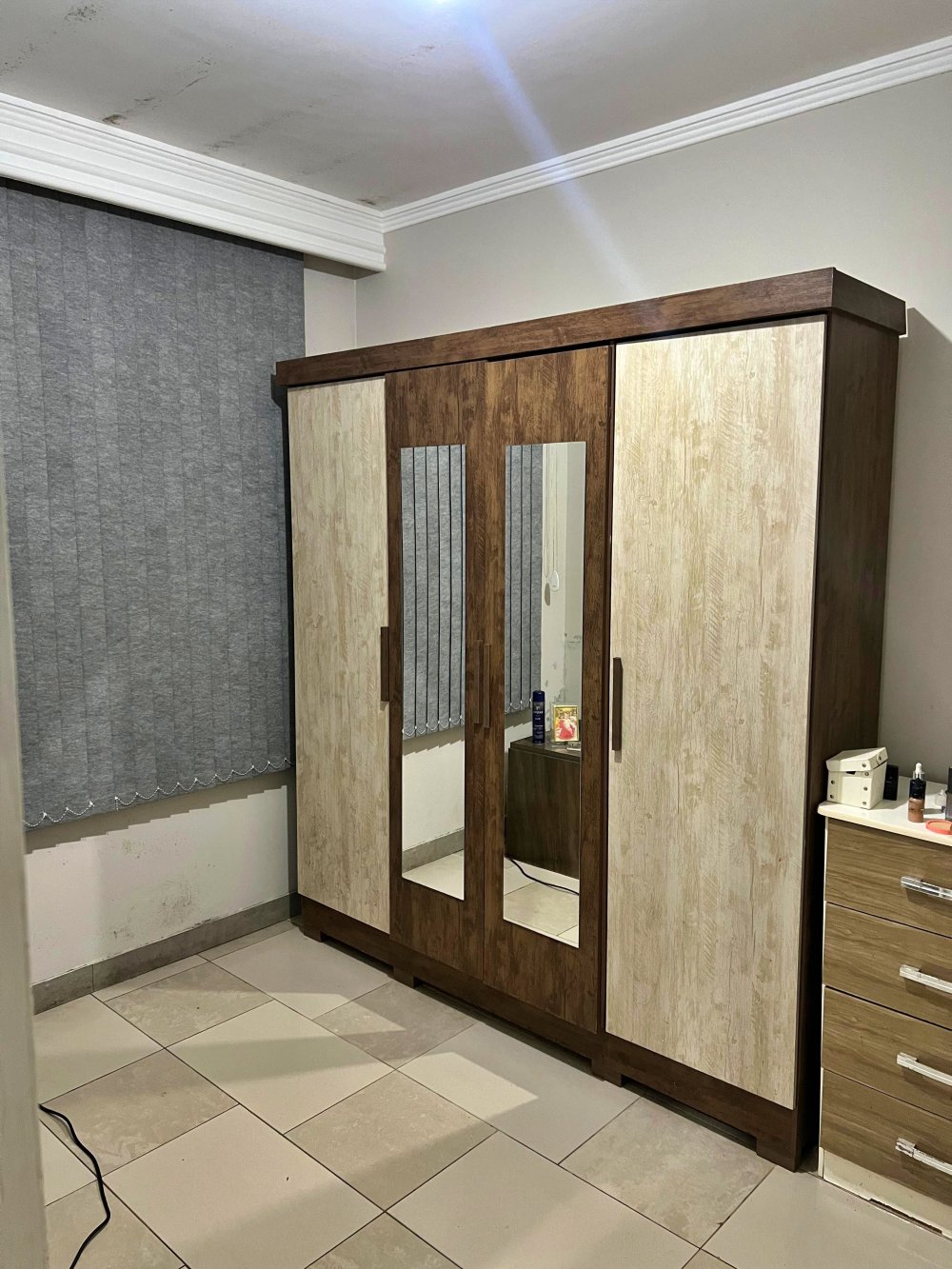 Este ambiente espaçoso pode ser adaptado às suas necessidades. Com armário em madeira natural e espelhos que criam profundidade, é ideal como segundo dormitório, quarto de hóspedes ou home office. A persiana vertical na janela permite o controle da luz, tornando o ambiente funcional em qualquer hora do dia.