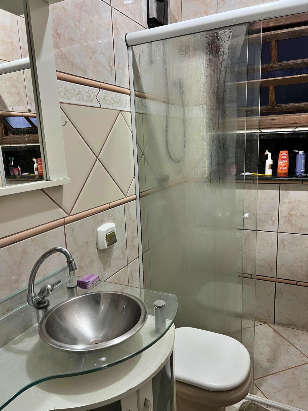 Com revestimento cerâmico em tons claros e detalhes decorativos sutis, o banheiro combina fácil manutenção com estilo. A bancada de vidro com cuba inox confere um visual contemporâneo, enquanto o box em vidro temperado oferece funcionalidade. Um espaço equilibrado entre estética e praticidade.