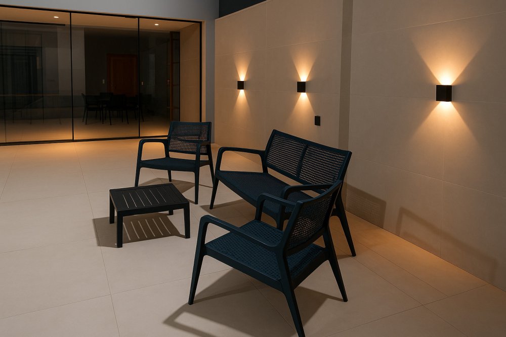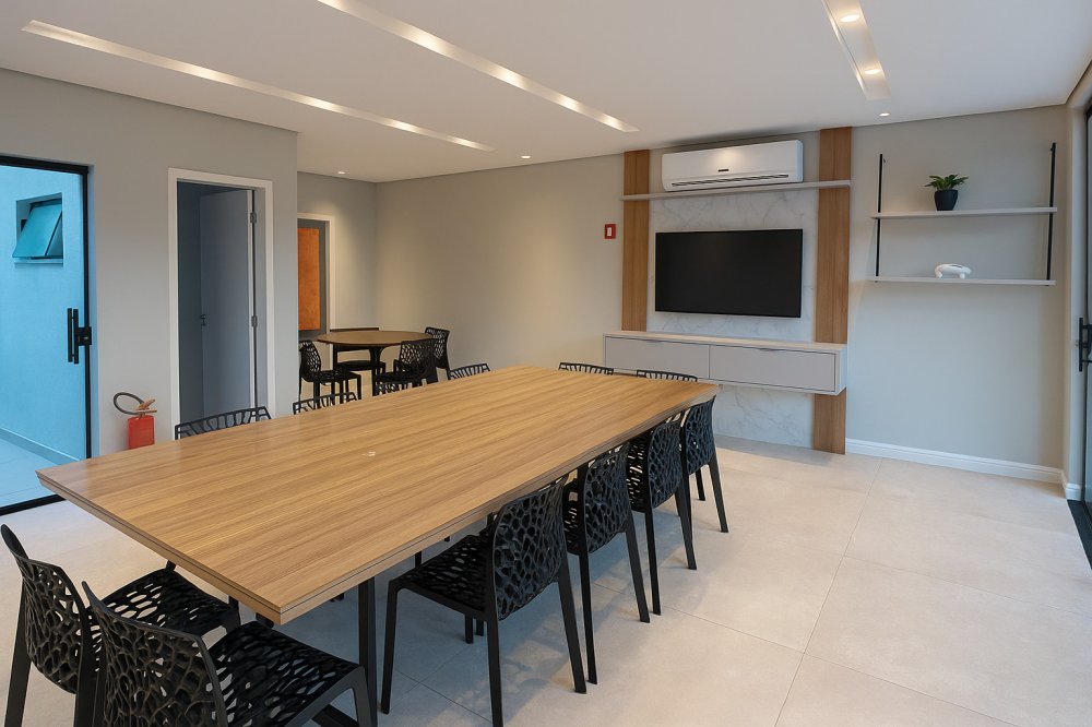 O hall de entrada impressiona com pé-direito duplo, colunas em mármore e iluminação cênica, criando uma atmosfera de hotel cinco estrelas desde o primeiro contato. A estrutura condominial é completa, contemplando áreas de lazer e convivência para todas as idades.