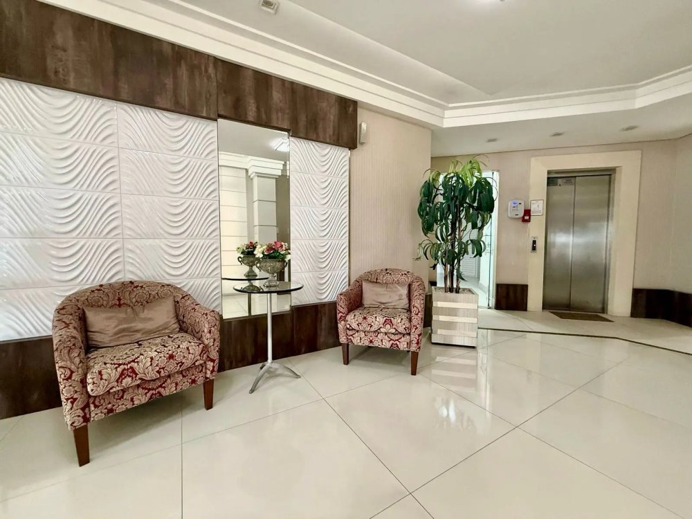 Logo ao entrar, o visitante é recebido por um hall elegante e acolhedor. Poltronas decorativas, espelhos amplos e painéis em relevo conferem sofisticação ao ambiente. A iluminação indireta reforça a sensação de conforto e requinte, refletida no piso em porcelanato polido.
