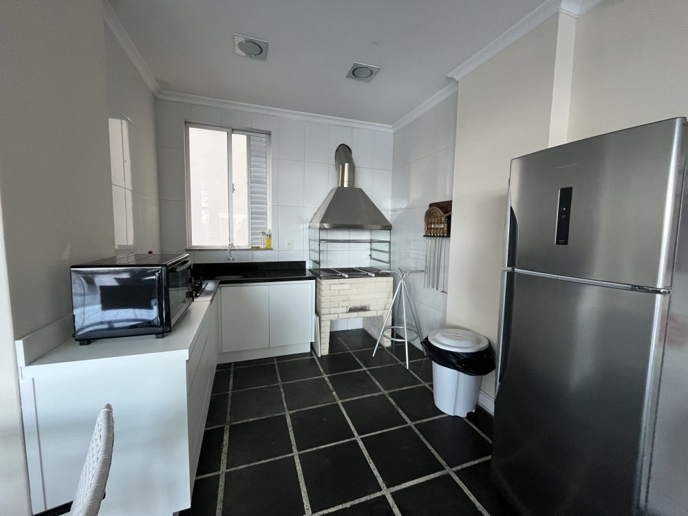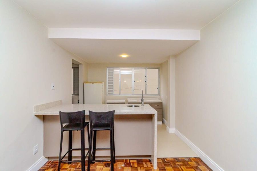 A cozinha se conecta ao living por uma bancada em granito, criando um espaço funcional e social ao mesmo tempo.