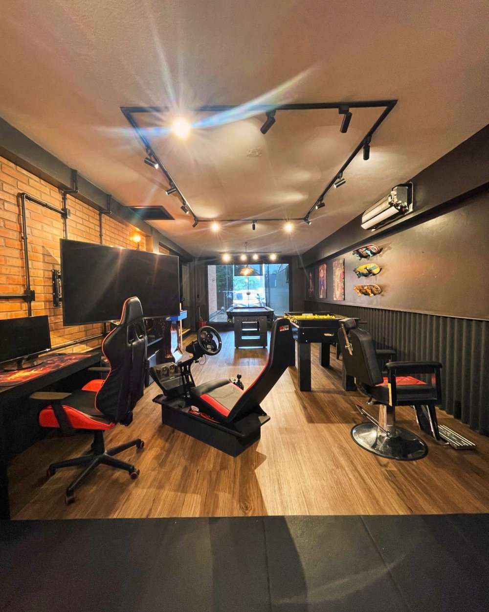 Um verdadeiro playground para adultos e crianças. O espaço reúne mesa de sinuca, pebolim, fliperama retrô, simuladores de corrida e bancada gamer com dois monitores. O revestimento em tijolinho aparente, iluminação em trilho e piso amadeirado reforçam o estilo urbano, enquanto o conforto do ambiente convida a horas de diversão. Um espaço que transforma qualquer noite comum em um evento memorável.