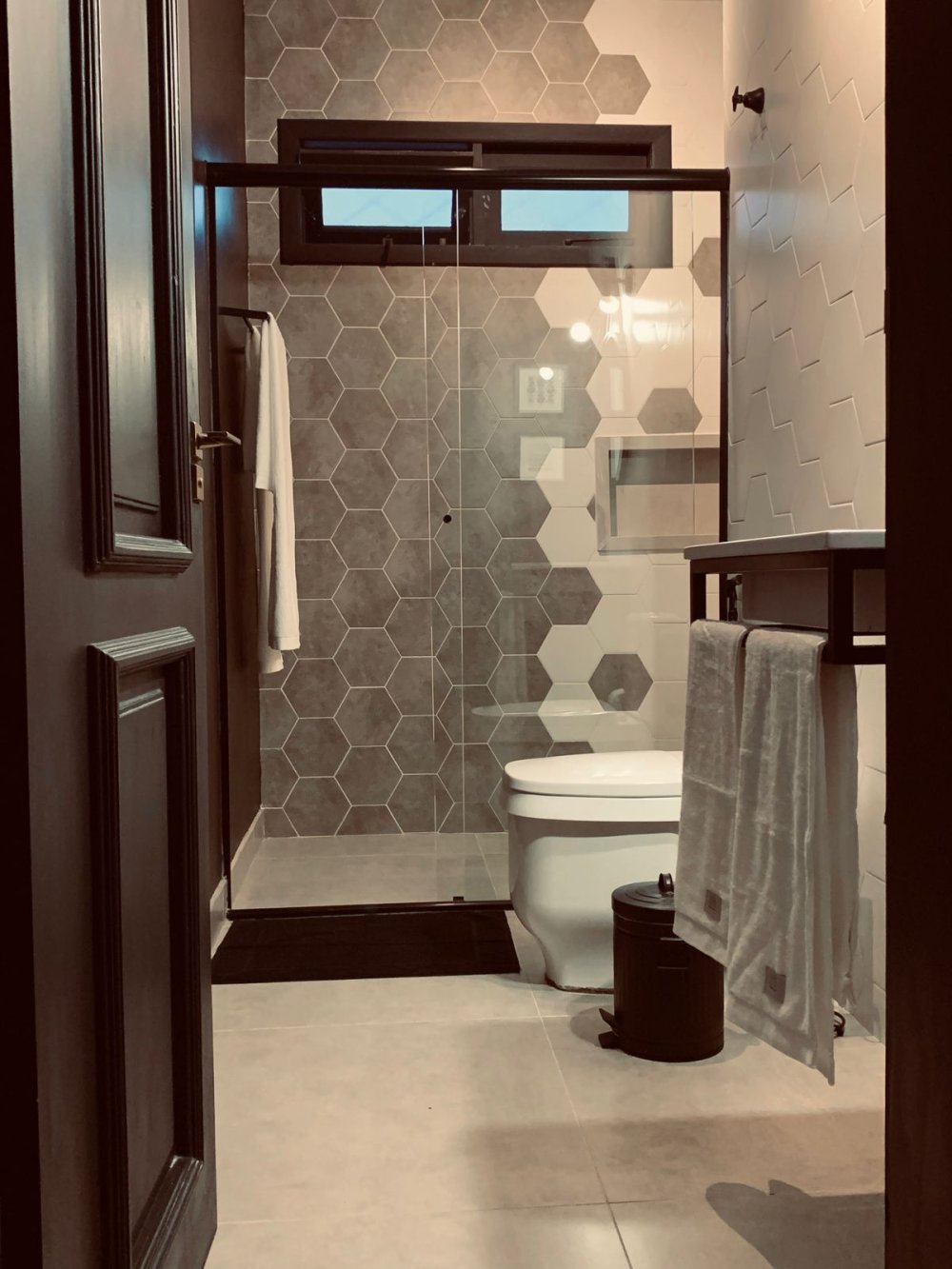 Revestimentos hexagonais em tons neutros do piso ao box criam um visual harmonioso. A cuba esculpida em pedra, os metais pretos foscos e a iluminação pontual reforçam o estilo moderno. Um ambiente funcional que não abre mão da estética.