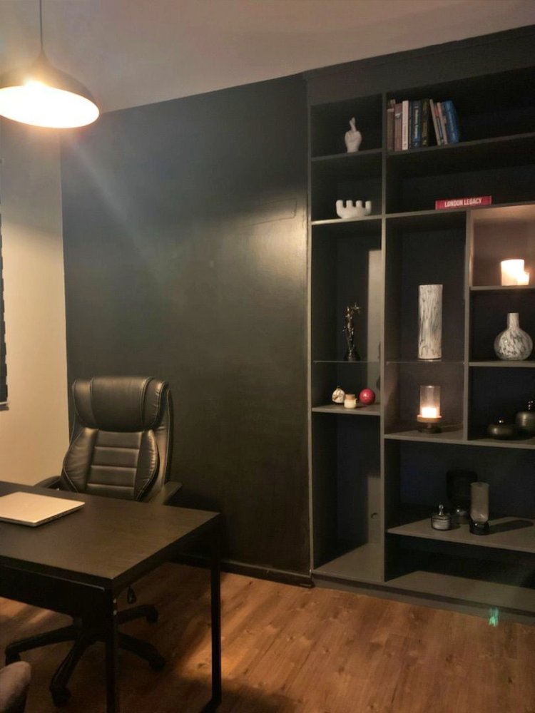 Ideal para profissionais que atuam em home office, o escritório tem atmosfera sóbria, com parede escura e iluminação pendente sobre a mesa. A estante embutida com nichos decorativos equilibra utilidade e estética. Aqui, o trabalho flui com tranquilidade e concentração.