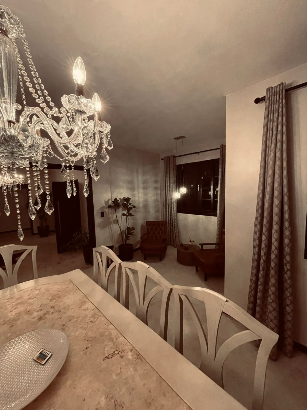 Anexa à sala de estar, a sala de jantar destaca-se pela mesa de mármore claro e cadeiras com encosto trabalhado. O destaque fica por conta do lustre de cristal que paira sobre a mesa, refletindo luz suave e tornando o ambiente perfeito para jantares especiais em família ou com amigos.