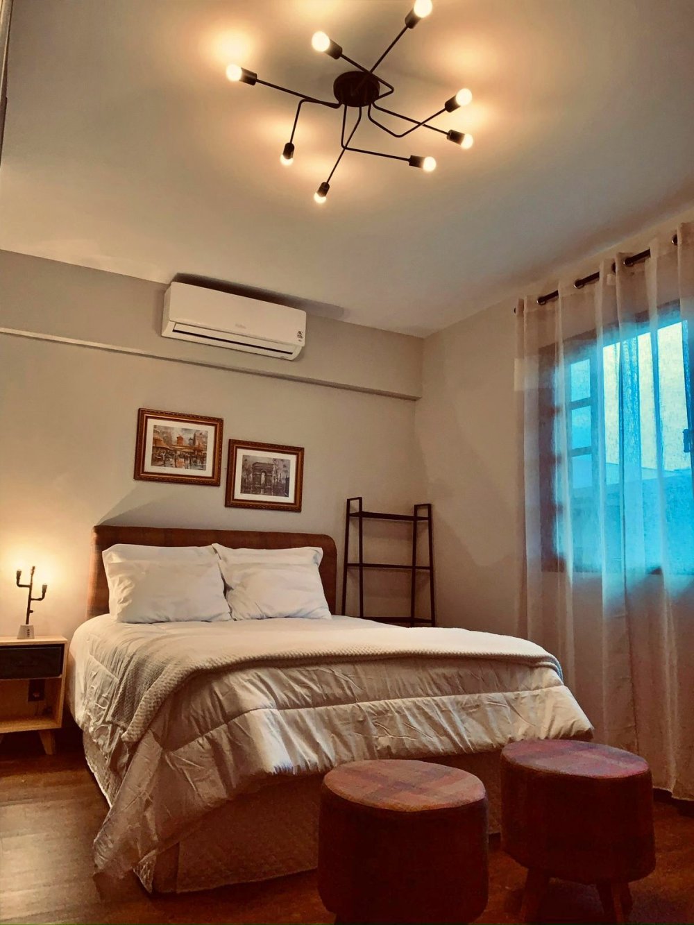 O segundo quarto mantém o padrão de conforto e iluminação natural. Com tons claros e decoração minimalista, transmite paz e aconchego. A cama de casal e o ar-condicionado garantem noites tranquilas em qualquer estação.