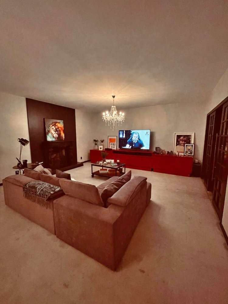 A sala de estar é um convite ao aconchego. O sofá em "L" se estende frente à lareira moderna com painel escuro decorado por arte contemporânea. O lustre clássico contrasta com a decoração minimalista, criando um equilíbrio entre conforto e design. A circulação é fluida, ideal para quem gosta de receber bem.