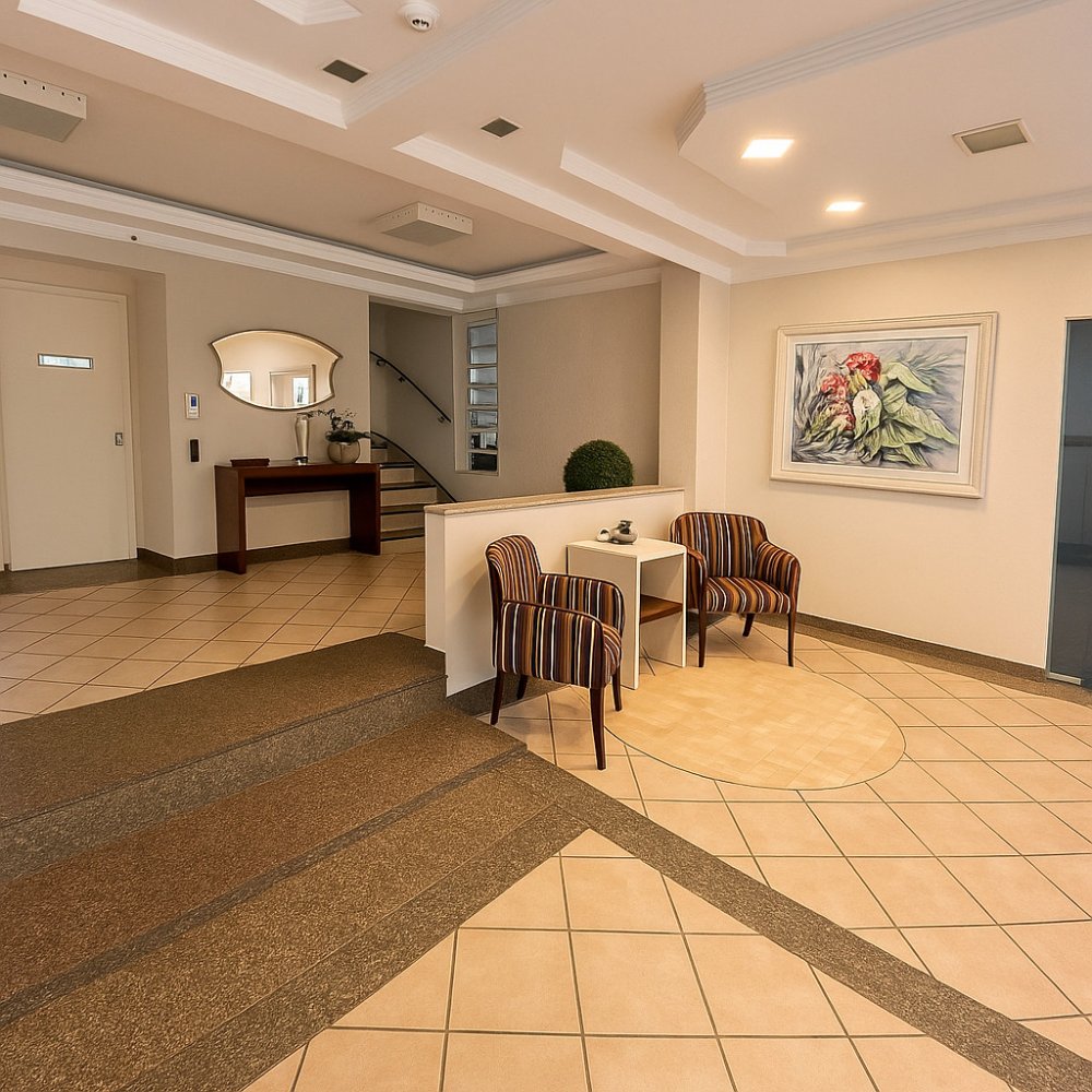 Com decoração sofisticada, iluminação indireta e poltronas confortáveis, o hall combina estética refinada com funcionalidade. Um ambiente climatizado, perfeito para recepcionar moradores e visitantes com charme e tranquilidade.
