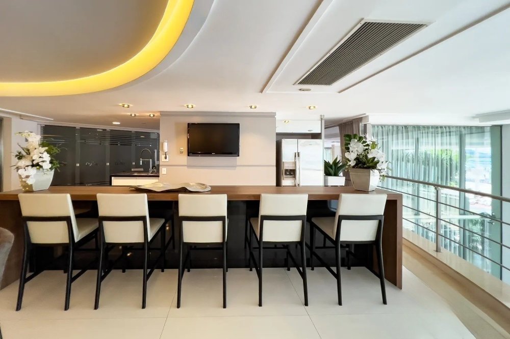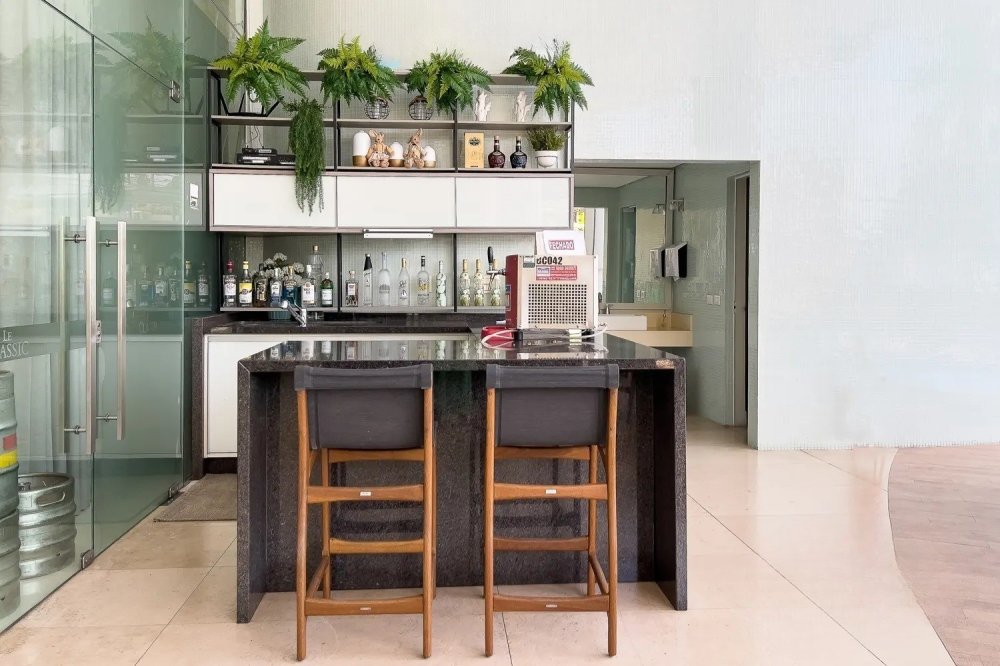 O bar interno, com balcão de granito escuro, adega decorativa e iluminação intimista, é perfeito para receber convidados em grande estilo. Logo ao lado, o lounge social convida ao relaxamento com poltronas elegantes, arranjos florais e uma ambientação que mistura o clássico com o contemporâneo, promovendo encontros memoráveis com conforto e charme.