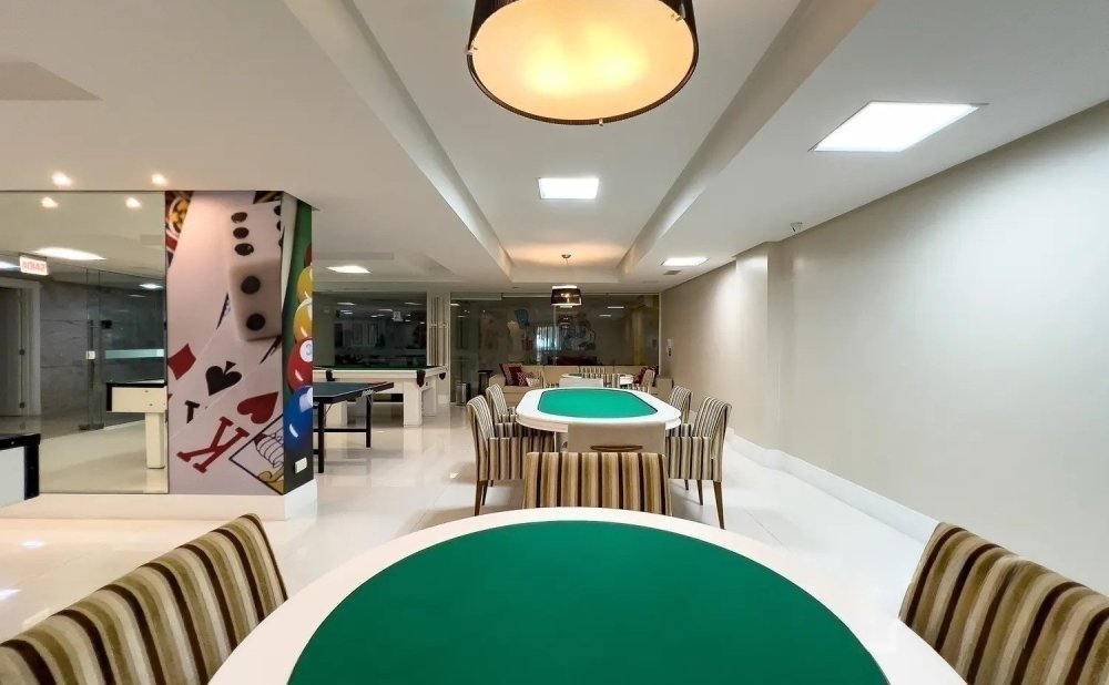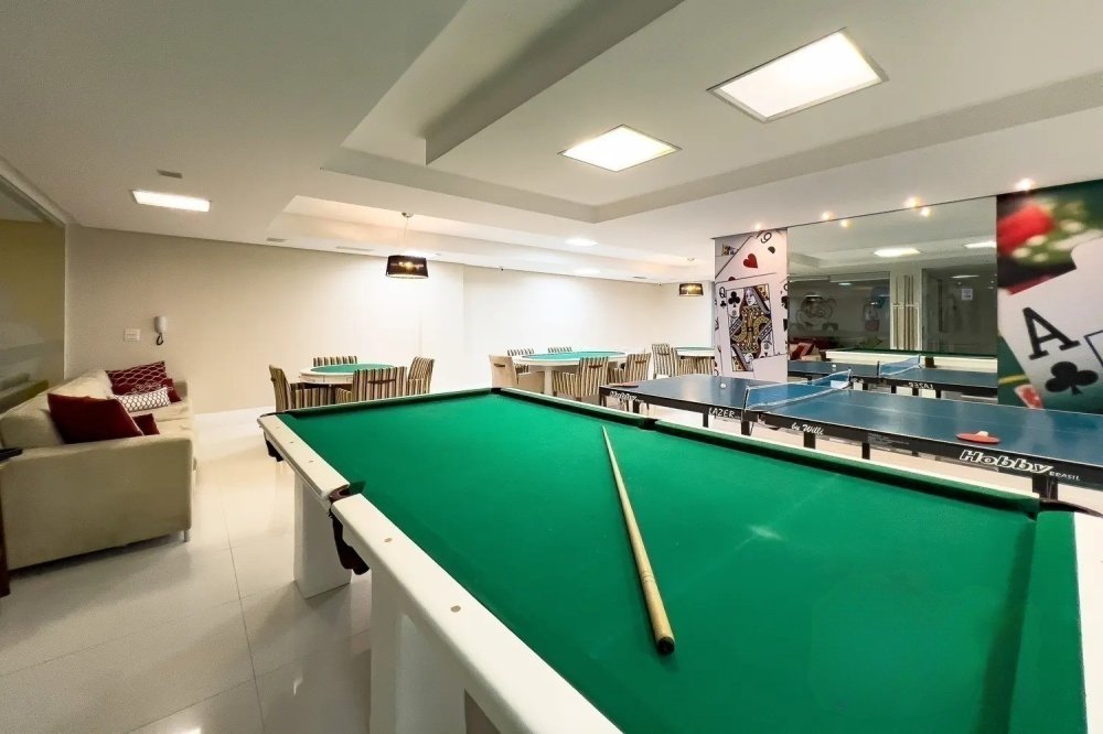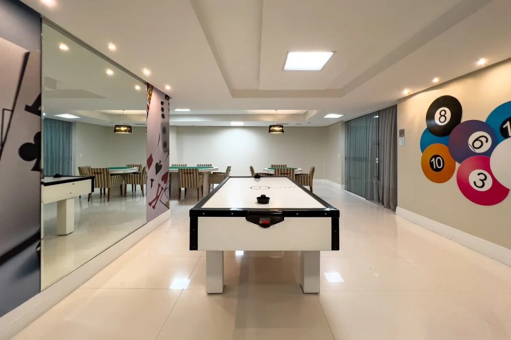Mesas de sinuca, carteado, ping-pong e air hockey fazem do salão de jogos um espaço vibrante para adultos e jovens. A decoração temática e a disposição dos ambientes criam um ambiente descontraído, perfeito para socializar com amigos ou curtir momentos de lazer em família.
