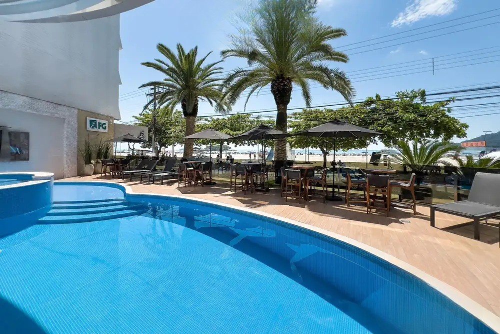 Com borda curva e revestimento em pastilhas azuis, a piscina do Le Classic é mais do que um local para nadar - é um refúgio. Integrada a um deck panorâmico com espreguiçadeiras e paisagismo tropical, ela oferece uma vista direta para o mar de Balneário Camboriú que encanta todos os sentidos. Imagine começar o dia com um mergulho enquanto o sol nasce no horizonte ou brindar ao entardecer com a brisa marítima como companhia.