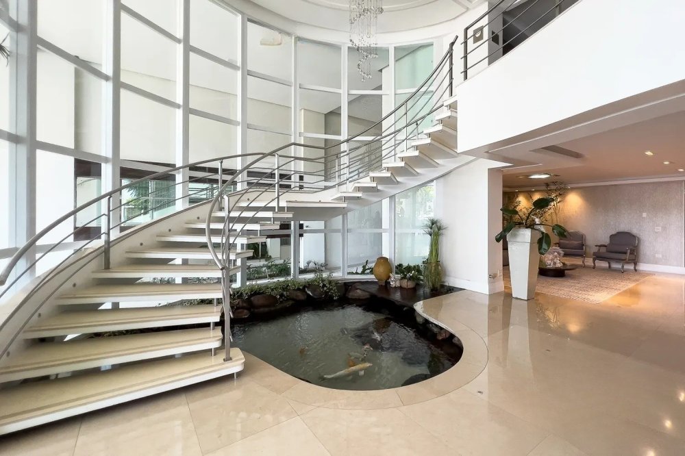 Ao entrar no Le Classic, o impacto visual é imediato: um hall com pé-direito duplo, escada curva flutuante e espelho d'água com carpas ornamentais cria uma atmosfera de imponência e leveza ao mesmo tempo. Elementos como vidro, vegetação interna e design arquitetônico refinado tornam este espaço um verdadeiro cartão de visitas do prédio.
