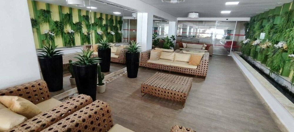 O lounge do Lafayette traz um toque de natureza ao cotidiano. O jardim vertical com plantas tropicais e os móveis em fibra natural criam um clima zen, ideal para leitura, conversas ou relaxamento.