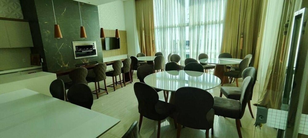Com design arrojado e funcional, o salão de festas possui pé direito duplo, grandes janelas envidraçadas e cortinas de linho que conferem leveza ao ambiente. As mesas redondas, a bancada gourmet e a churrasqueira embutida tornam o espaço ideal para comemorações inesquecíveis.