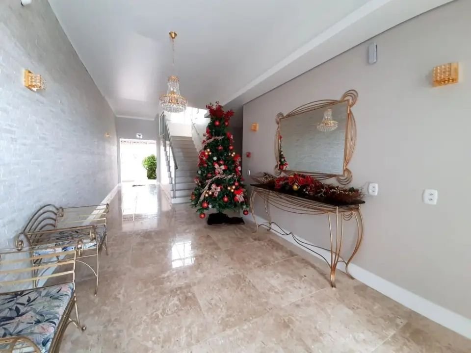 Logo ao entrar no edifício, você é recepcionado por um hall elegante e acolhedor, com piso em mármore polido e iluminação suave por lustres pendentes que criam uma atmosfera de sofisticação. O espelho com moldura clássica, o aparador metálico e a decoração de boas-vindas sazonal, como a tradicional árvore de Natal, tornam o ambiente ainda mais encantador - um verdadeiro cartão de visita para quem valoriza a estética e o cuidado nos detalhes.