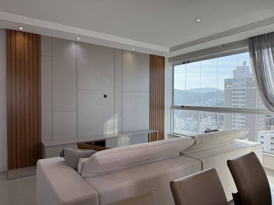 Com janelas amplas e excelente iluminação natural, a sala é perfeita para momentos de lazer e relaxamento. Aqui, cada detalhe foi pensado para criar memórias: desde um jantar íntimo até uma noite de filmes em família.