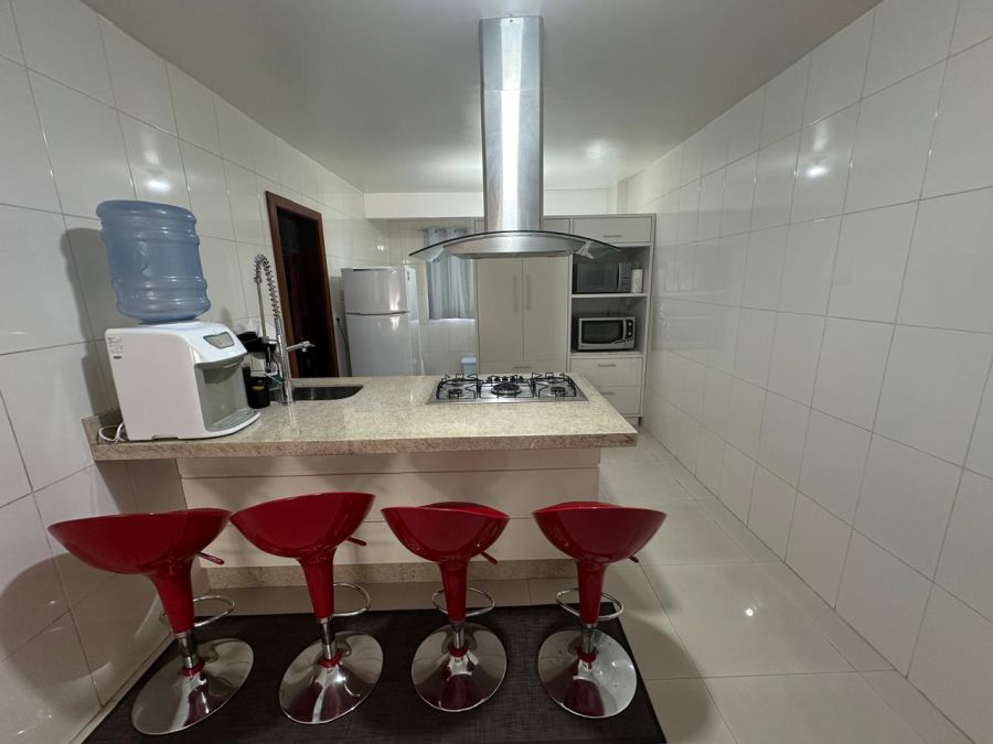 Ampla, azulejada do piso ao teto e equipada com bancada em granito e ilha central com cooktop. Os quatro bancos altos vermelhos trazem um toque moderno, e o espaço é perfeito para quem ama cozinhar ou reunir amigos enquanto prepara uma refeição. Prática e funcional, com ótima circulação.