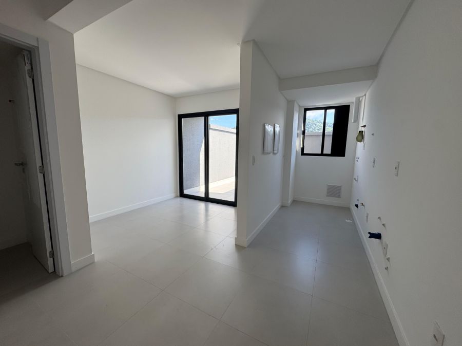 Ao entrar no imóvel, você é recebido por uma sala ampla com piso porcelanato claro, que amplia a sensação de espaço e reflete a luz natural que entra generosamente pelas portas de vidro que levam ao terraço. O espaço é ideal para montar uma sala de TV confortável e moderna ou um ambiente de convivência descontraído para receber amigos e familiares.