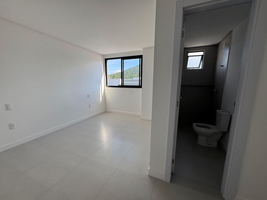 No piso superior, o dormitório principal é um convite ao descanso. Com janela de abrir em alumínio preto e vidro, oferece uma vista relaxante para as montanhas. A suíte, equipada com espera para ar-condicionado e banheiro ventilado naturalmente, garante conforto e bem-estar todos os dias.