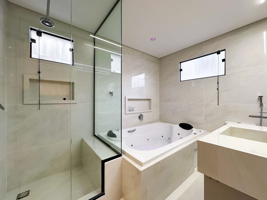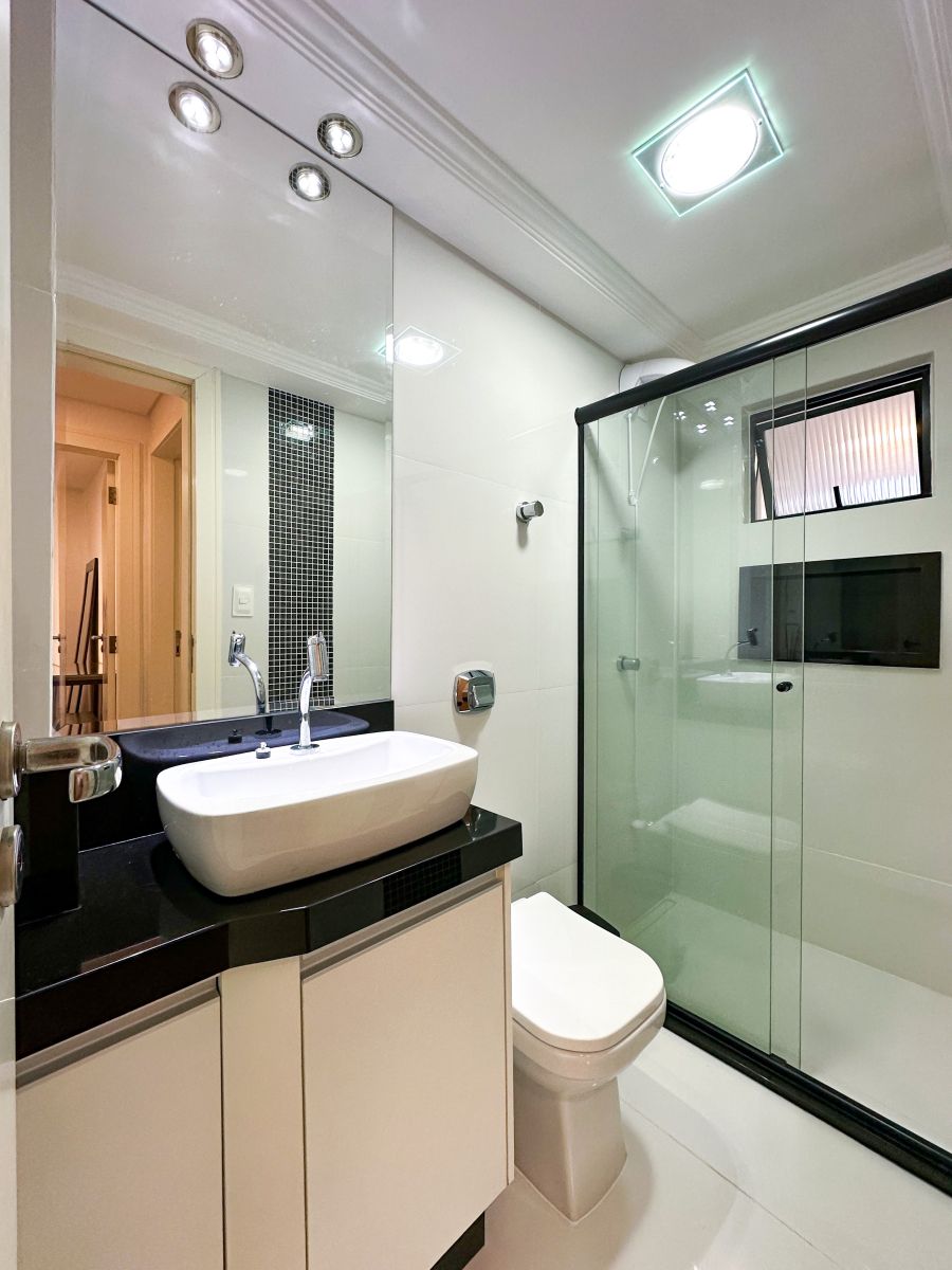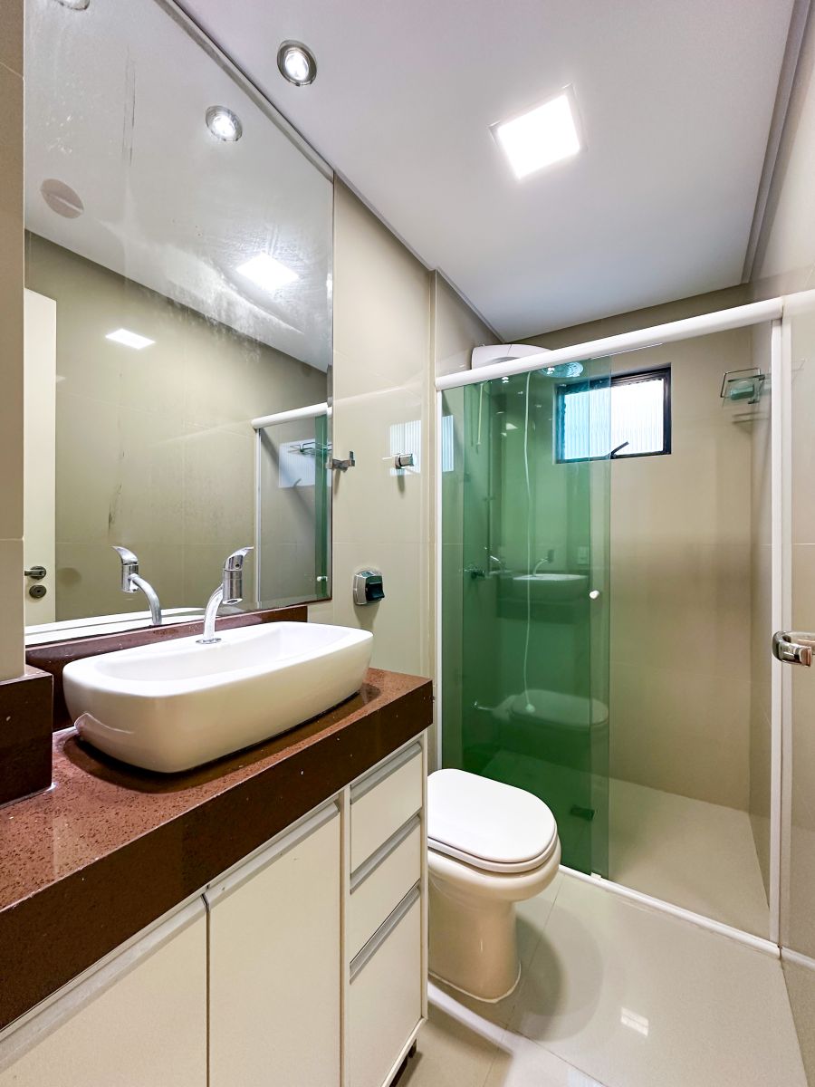 Os banheiros foram projetados para oferecer praticidade e sofisticação, com bancadas em granito, cubas esculpidas e boxes de vidro temperado. O uso de revestimentos modernos e iluminação bem posicionada reforça a atmosfera de bem-estar.