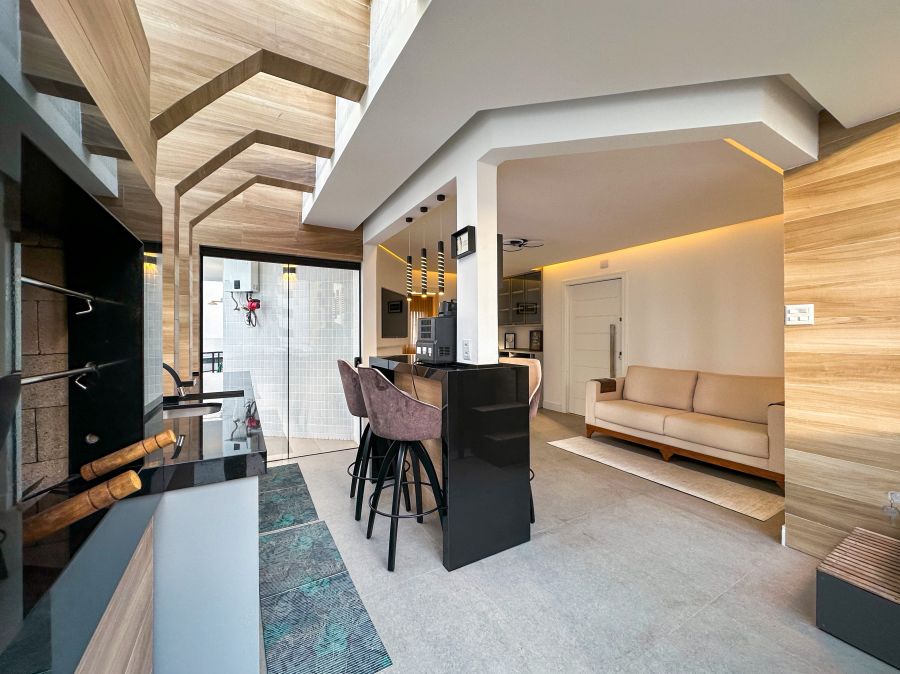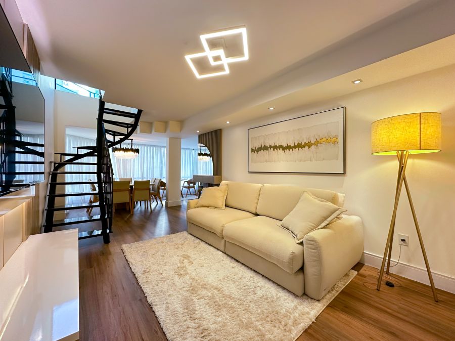 A cobertura duplex oferece um layout funcional e elegante, distribuído em dois pavimentos que equilibram privacidade e áreas sociais integradas. Ao entrar, você é recebido por um living moderno com pé-direito duplo e iluminação projetada para valorizar cada detalhe do espaço. O piso em madeira traz aconchego, enquanto a escada caracol metálica adiciona um toque contemporâneo à decoração.