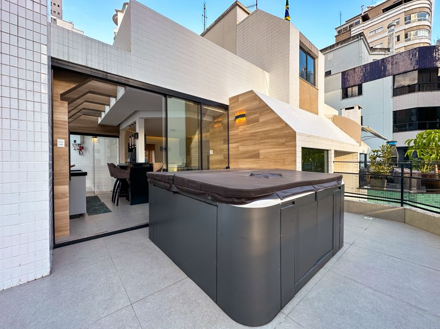Ao lado, a hidromassagem no terraço é protagonista - com design ergonômico e capacidade para receber família e amigos. O ambiente é envolto por um deck e cercado por vistas que mesclam o urbano e o litoral, criando um cenário único.