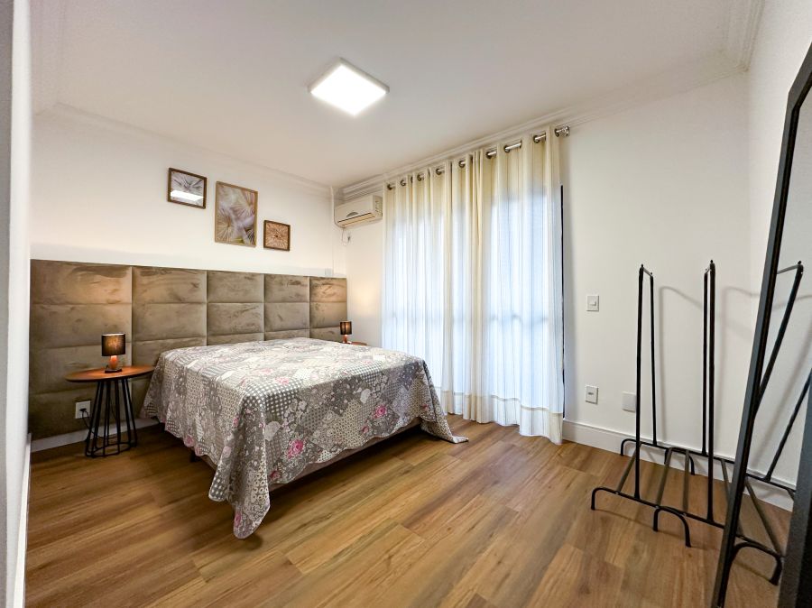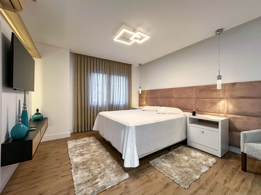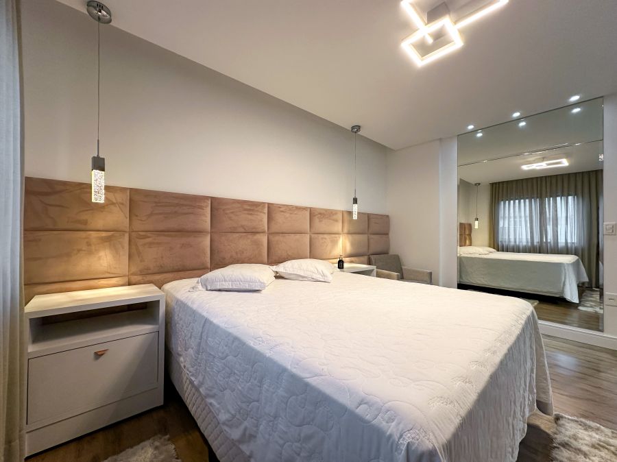 A cobertura dispõe de 3 dormitórios, sendo 2 suítes. Todos os quartos apresentam um cuidado especial com iluminação, ventilação e disposição de móveis planejados. As suítes principais contam com cabeceiras estofadas e varandas, ampliando a sensação de espaço e conexão com o exterior.