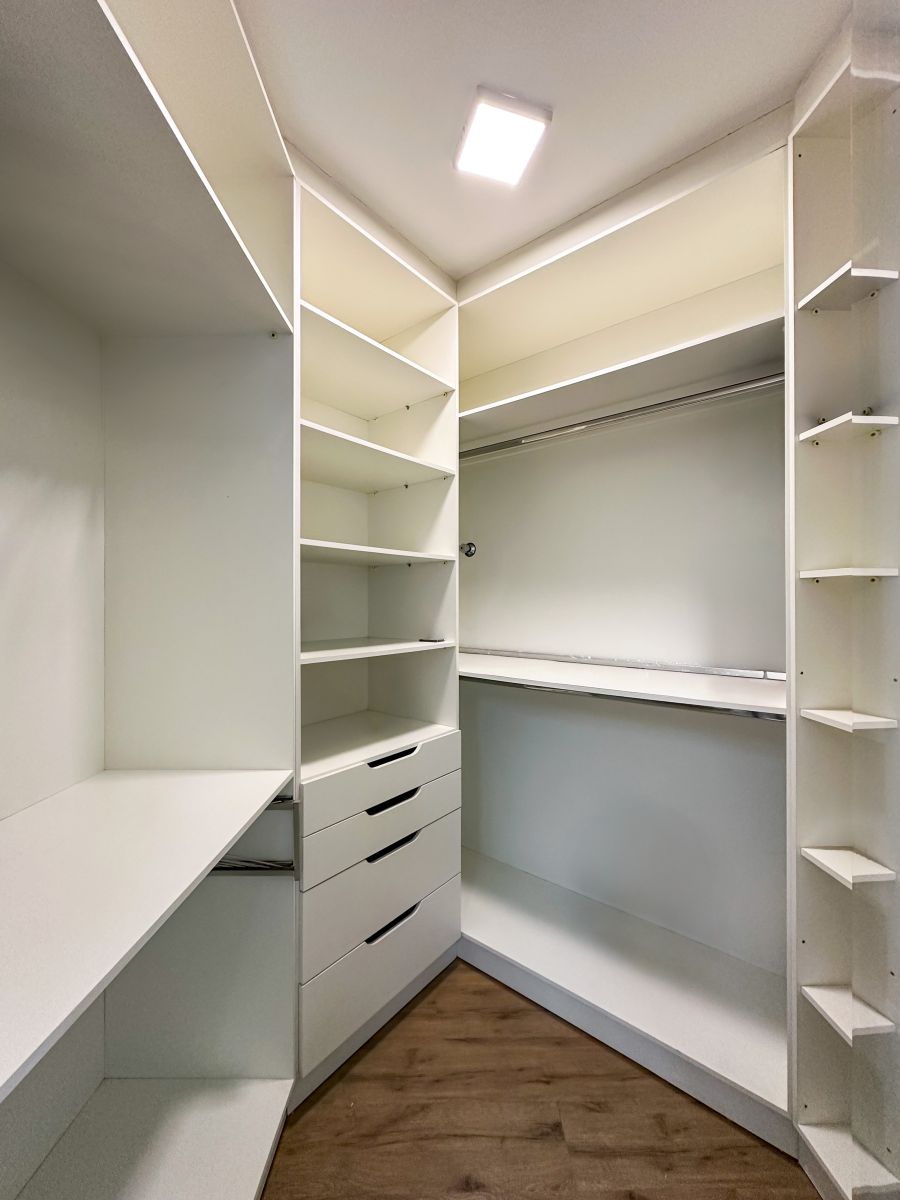 Uma das suítes é acompanhada por um closet planejado com múltiplos nichos, gavetas e prateleiras, otimizando o espaço e facilitando a organização do dia a dia.