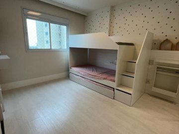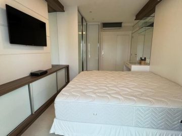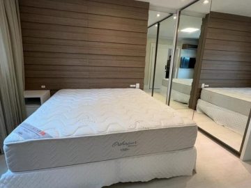 Cada dormitório possui armários planejados, iluminação indireta, painéis embutidos de TV e janelas amplas que garantem ventilação natural e sensação de amplitude.
