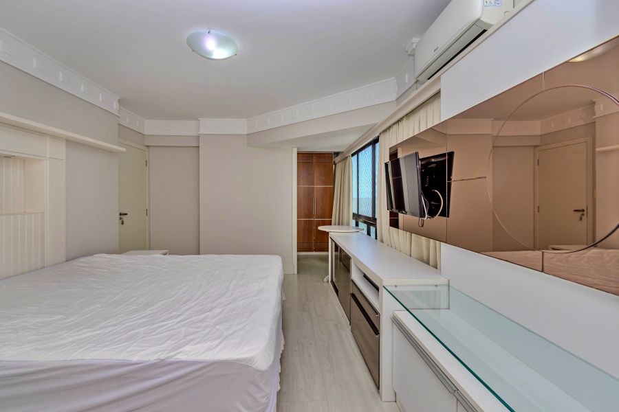 As três suítes oferecem conforto de metragem e privacidade, alinhadas à proposta de moradia frente mar de alto padrão.
