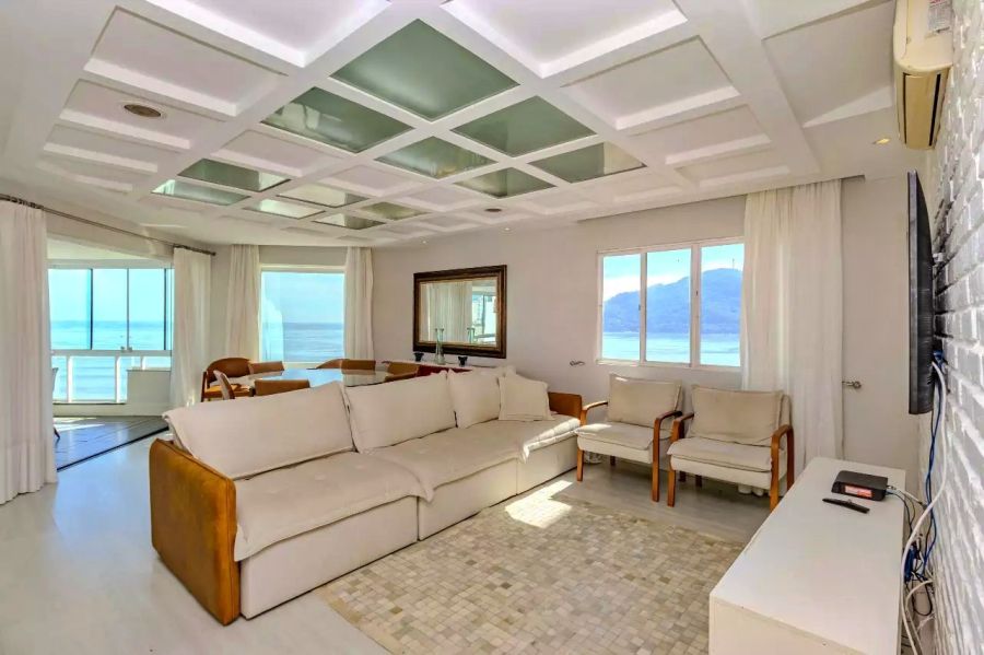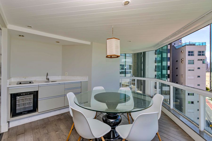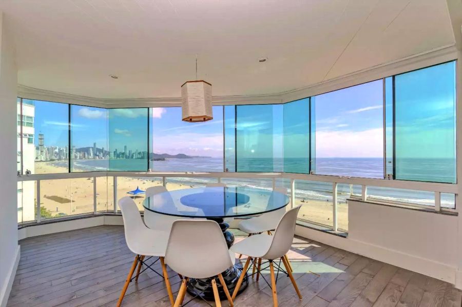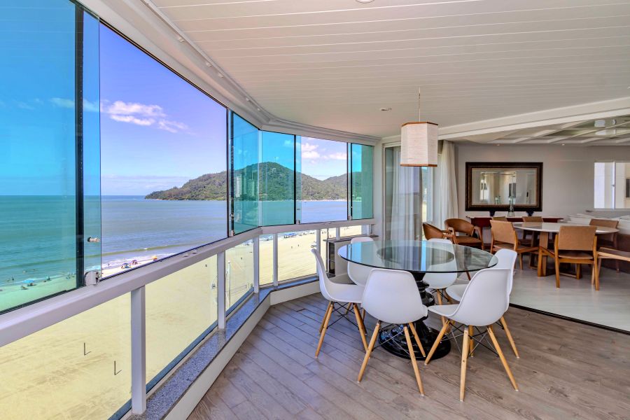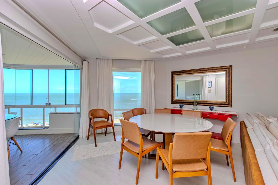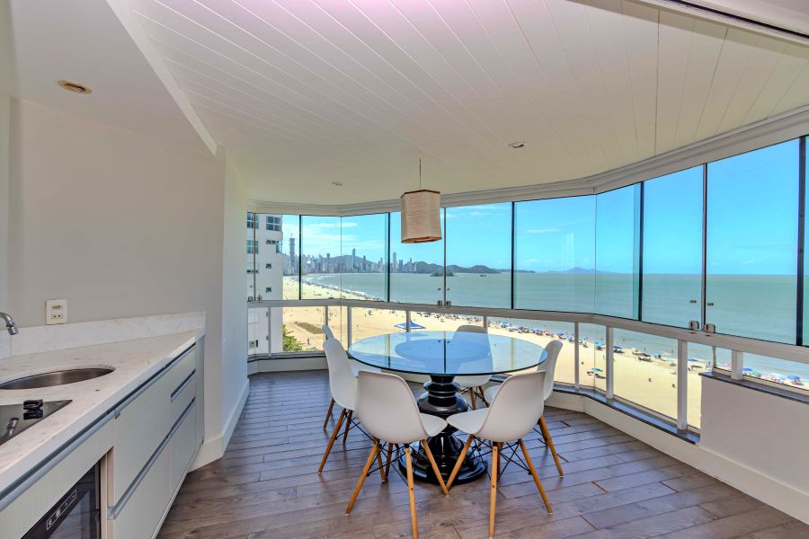 A sacada conta com churrasqueira, reforçando o uso social do espaço frente mar.