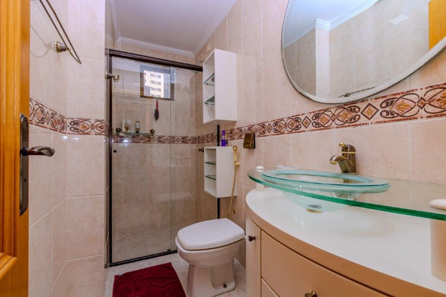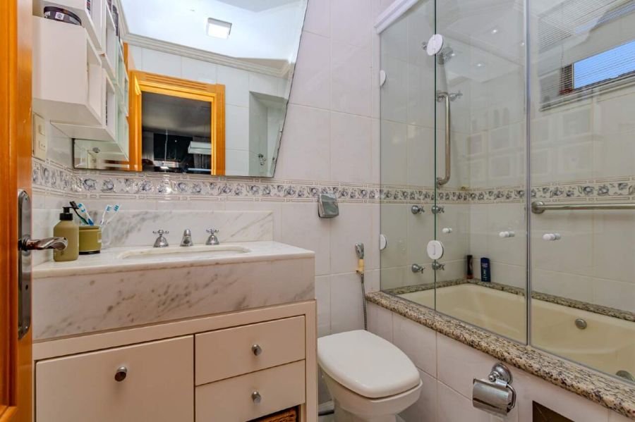 O banheiro da suíte conta com bancada em mármore e banheira de hidromassagem individual, criando um espaço de relaxamento privado. O banheiro social atende aos demais dormitórios e visitas, mantendo a mesma linguagem de acabamentos.