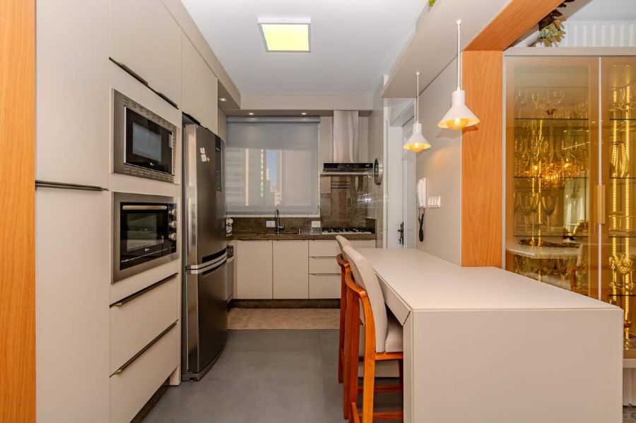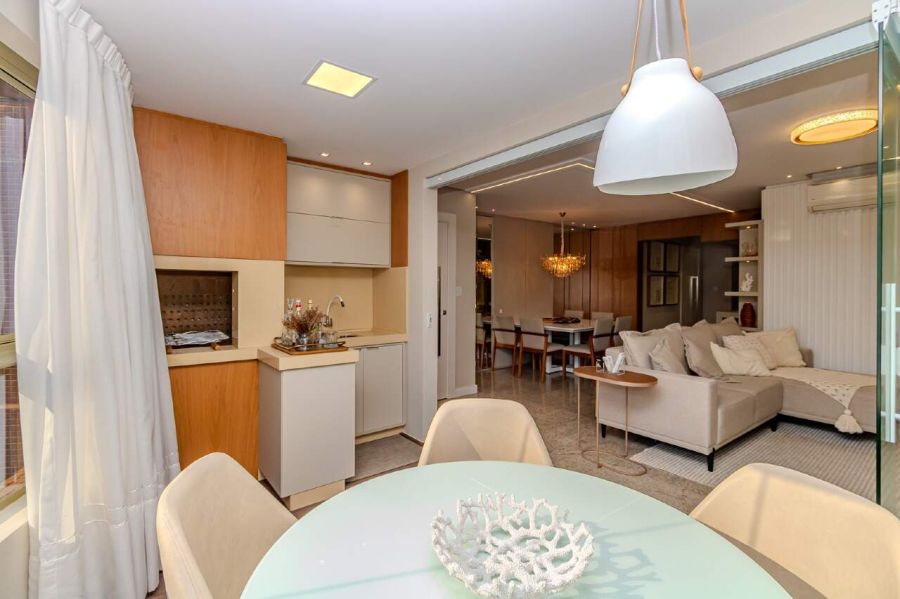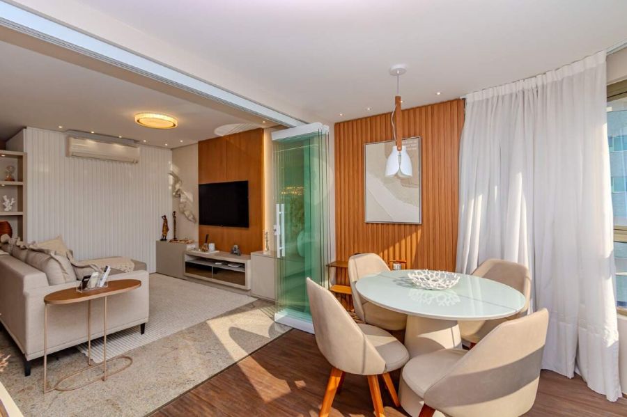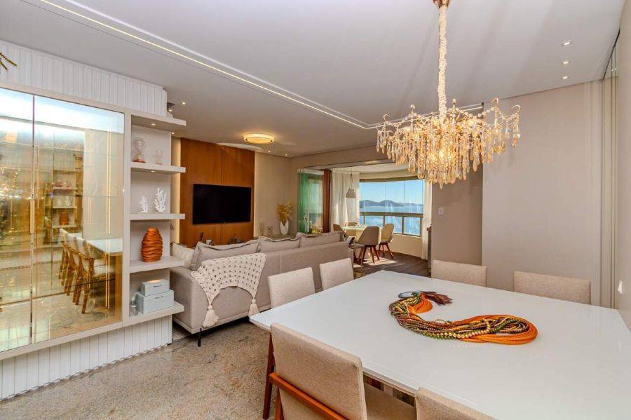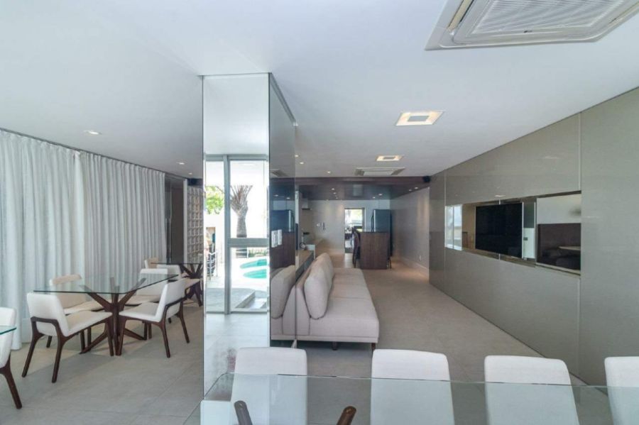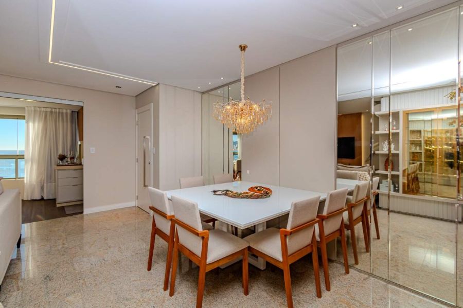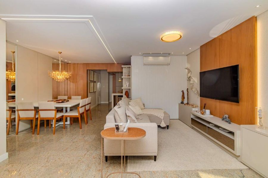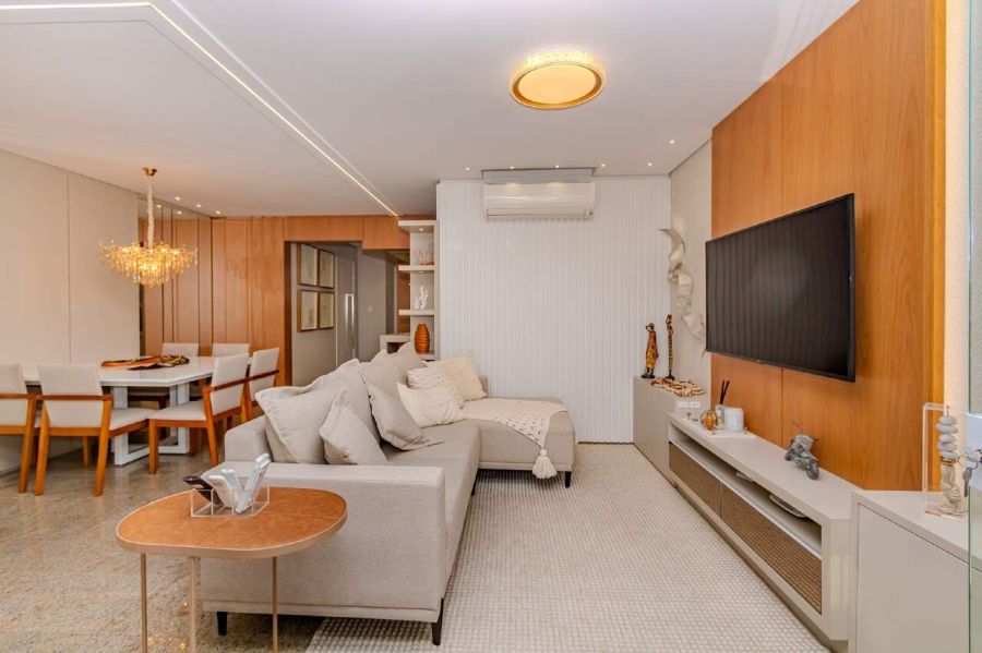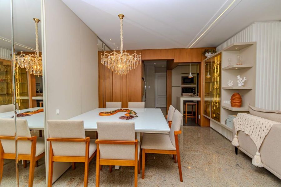 A sala de estar e TV é climatizada com ar-condicionado split, equipada com sofá e painel planejado, conectando-se à sala de jantar com mesa para 6 lugares, espelho decorativo e lustre de cristal. A cozinha americana integra-se ao ambiente principal e já está equipada com torre quente, forno, micro-ondas, geladeira duplex, lava-louças e cooktop.