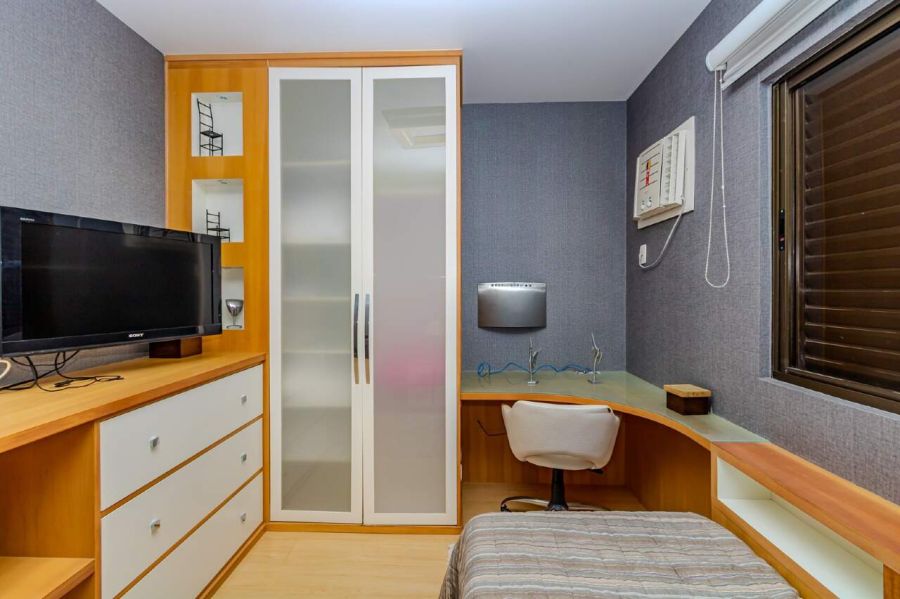 O segundo quarto está configurado com cama de solteiro e bancada de estudos, ideal para filhos, hóspedes ou home office com vista aberta.