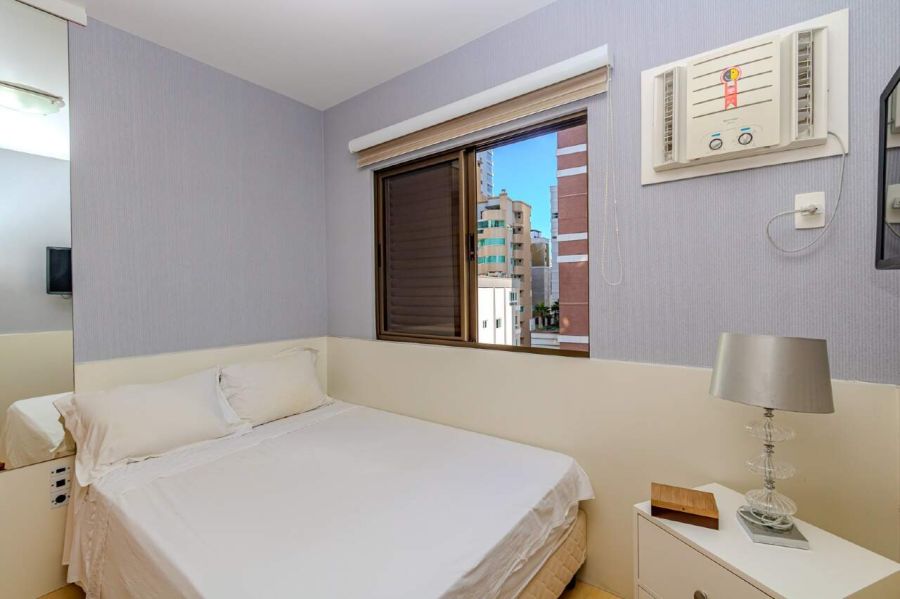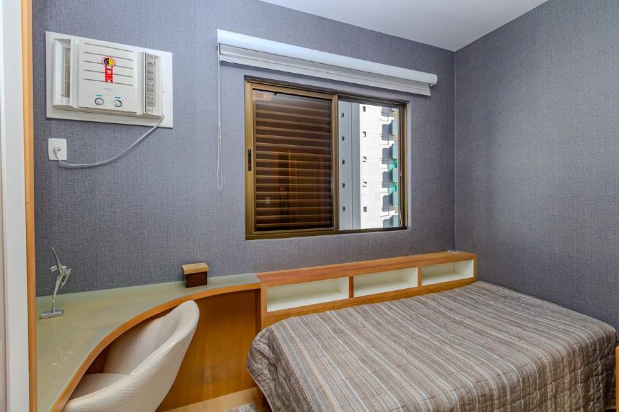 O primeiro dormitório possui cama de casal, roupeiro planejado, TV e vista lateral para o mar.