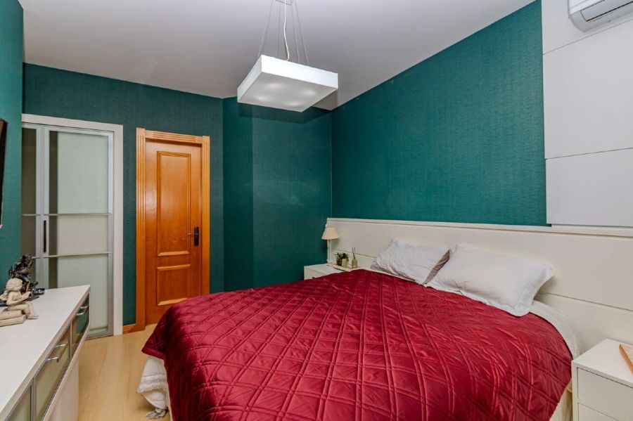 A suíte master é ampla, equipada com cama queen, painel de TV e closet com portas de correr em vidro fosco.