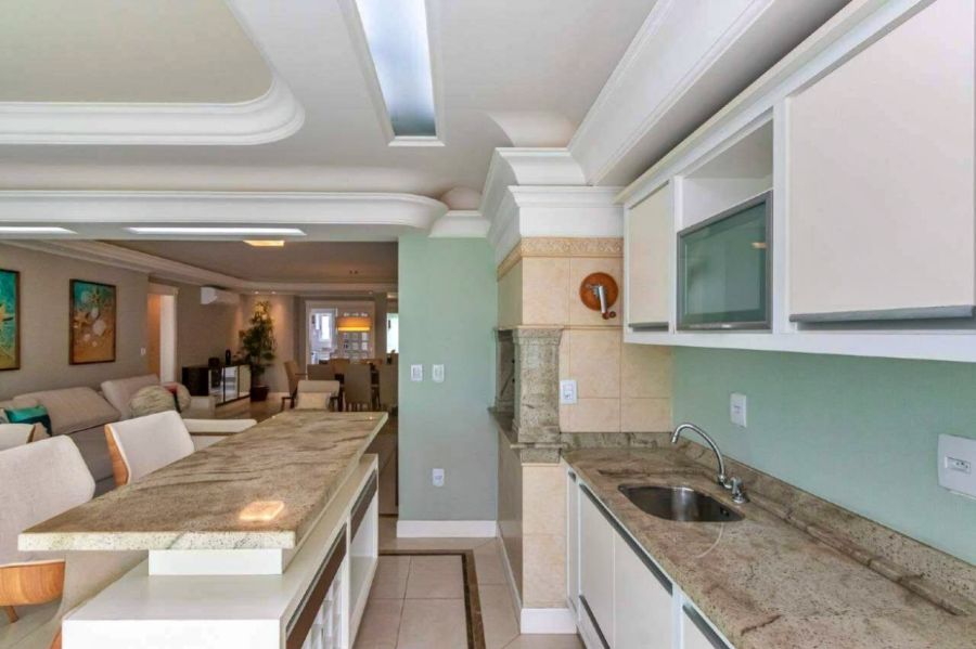 O espaço gourmet com churrasqueira a carvão amplia a experiência de receber. É o tipo de ambiente onde um almoço de domingo se prolonga sem pressa, com brisa do mar entrando suavemente pelas aberturas envidraçadas.