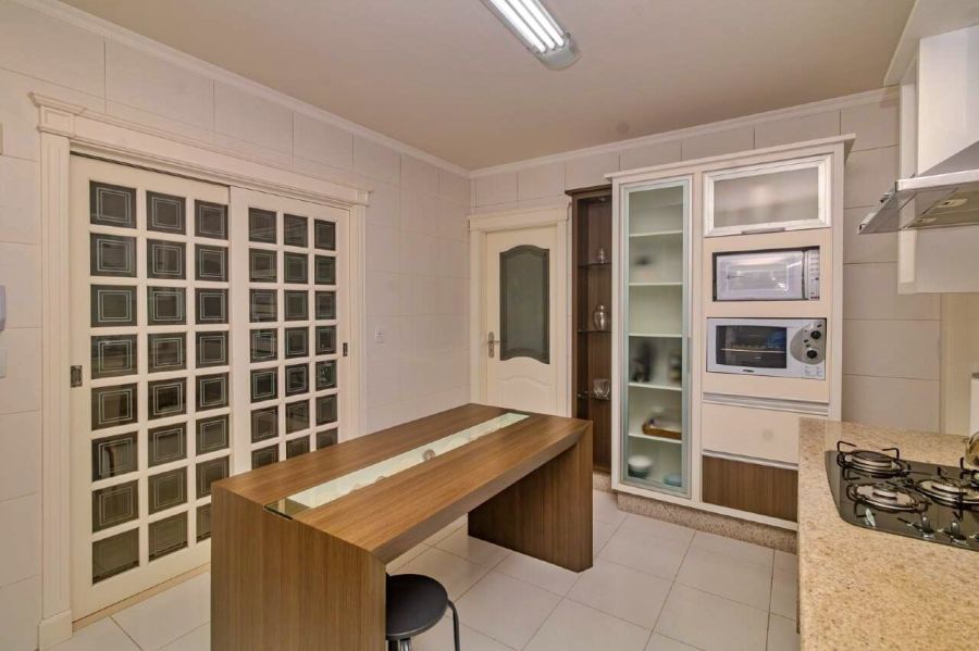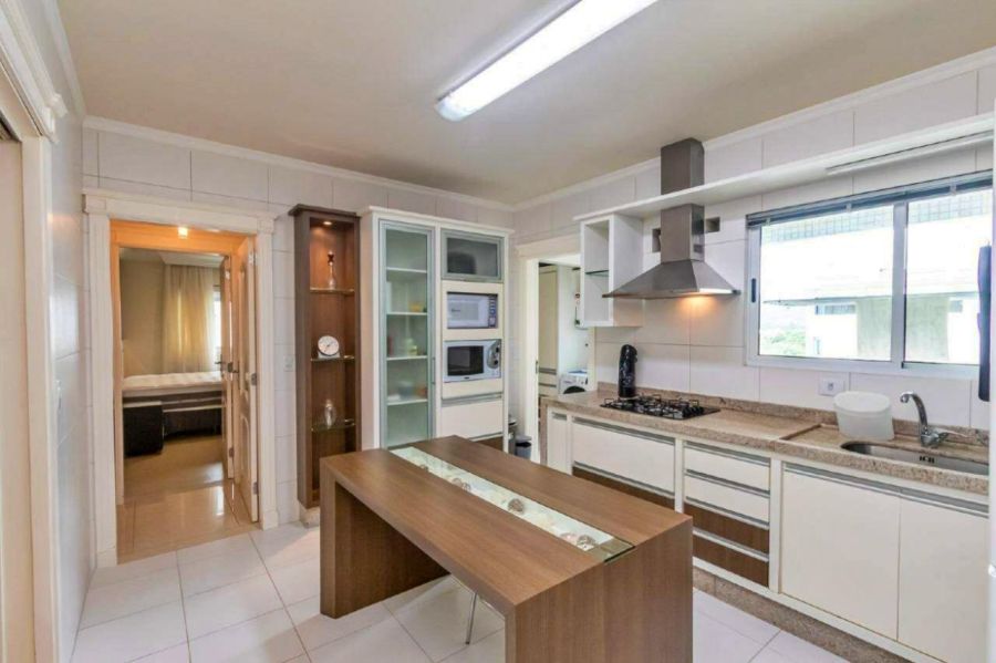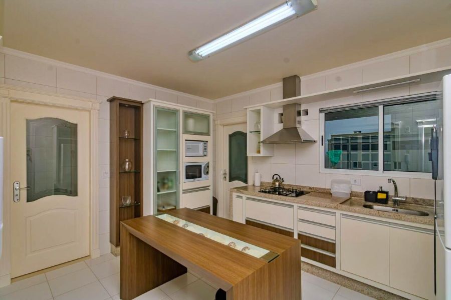 A cozinha, equipada e funcional, foi pensada para uso real: bancadas amplas, circulação confortável e integração inteligente com a área de serviço.