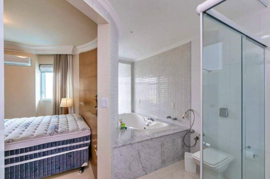 A suíte master oferece um refúgio reservado, com destaque para a banheira de hidromassagem, onde o banho noturno ganha atmosfera de spa particular.