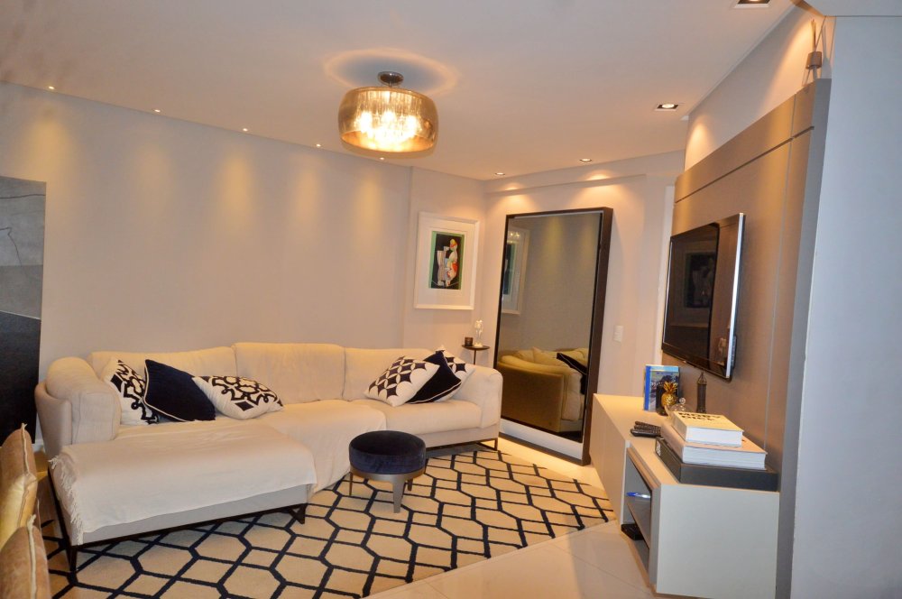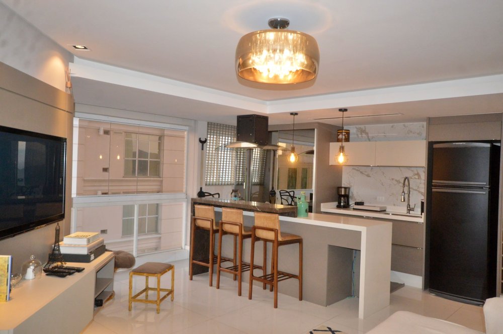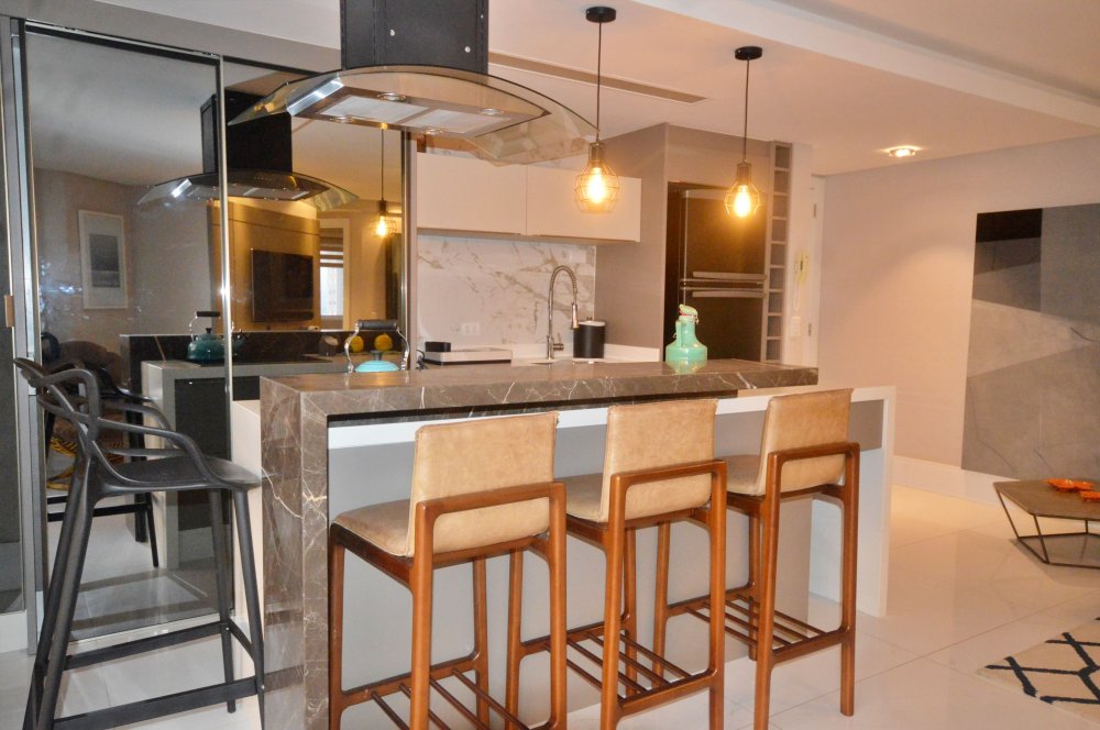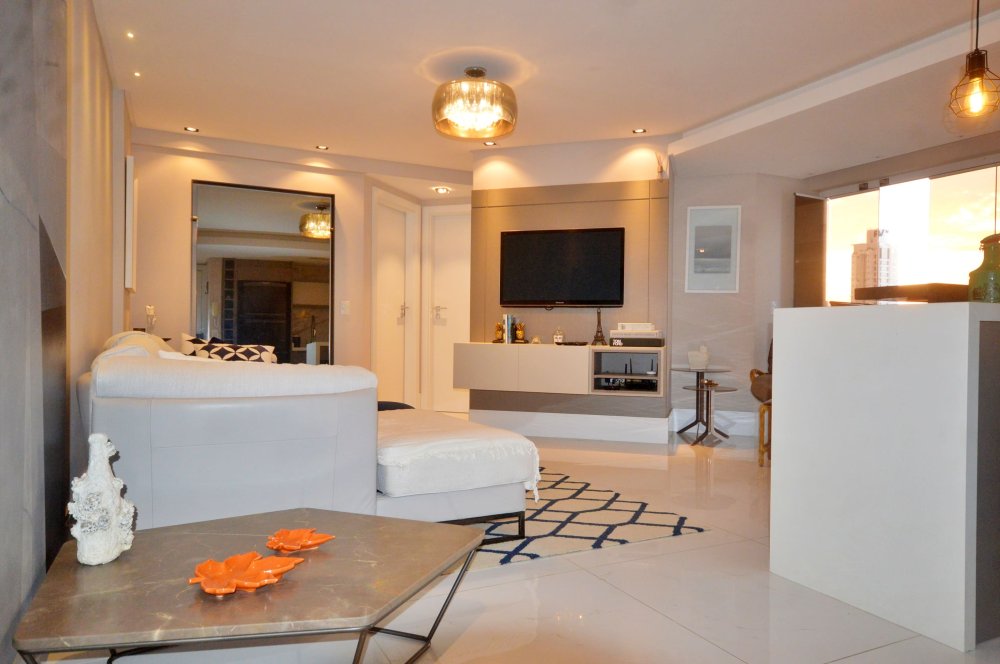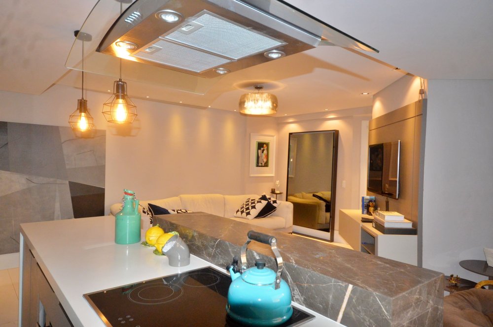 Ambientes decorados com sofisticação, incluindo eletros, iluminação e detalhes decorativos