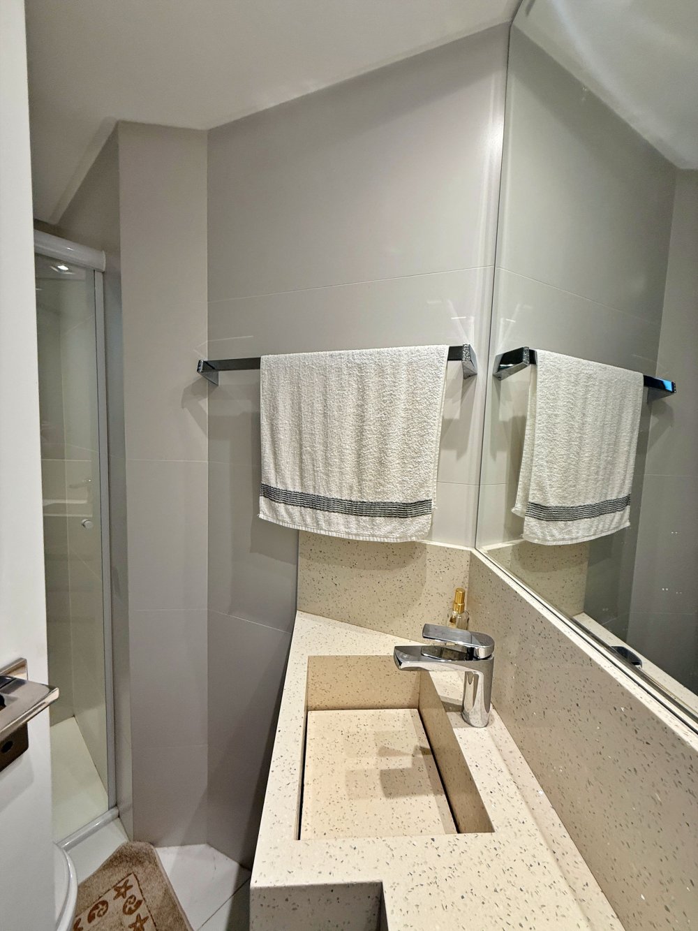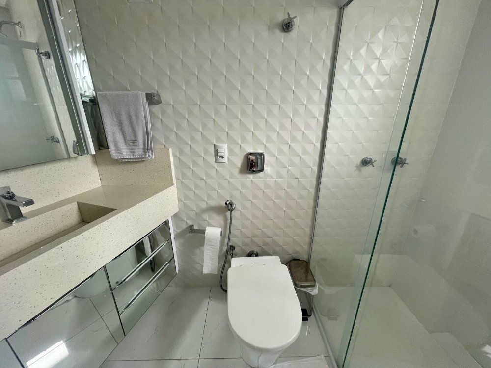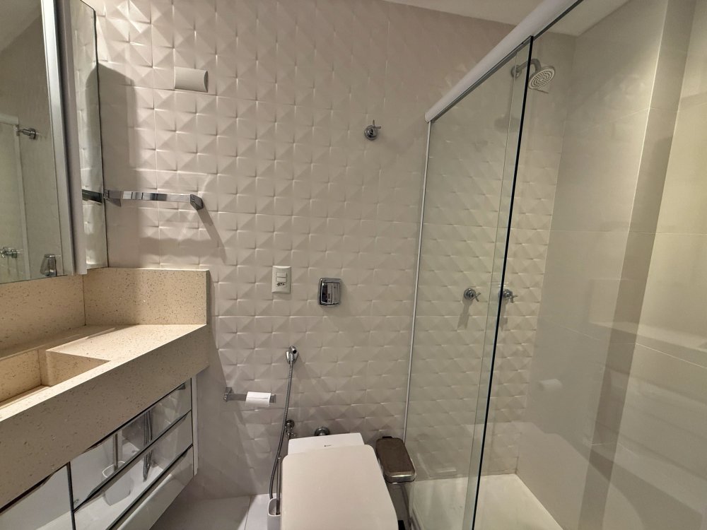 Banheiros com revestimentos nobres e box de vidro